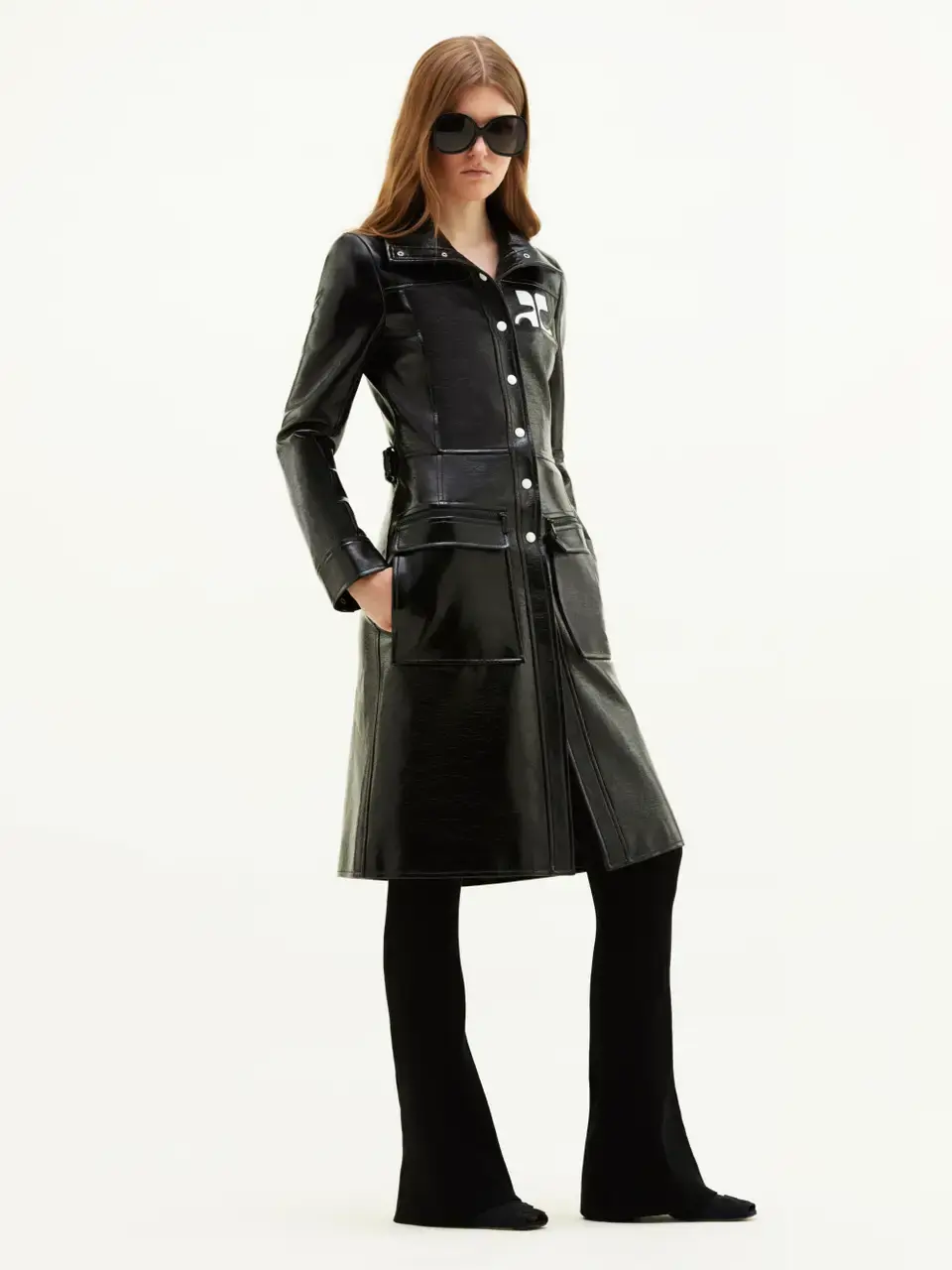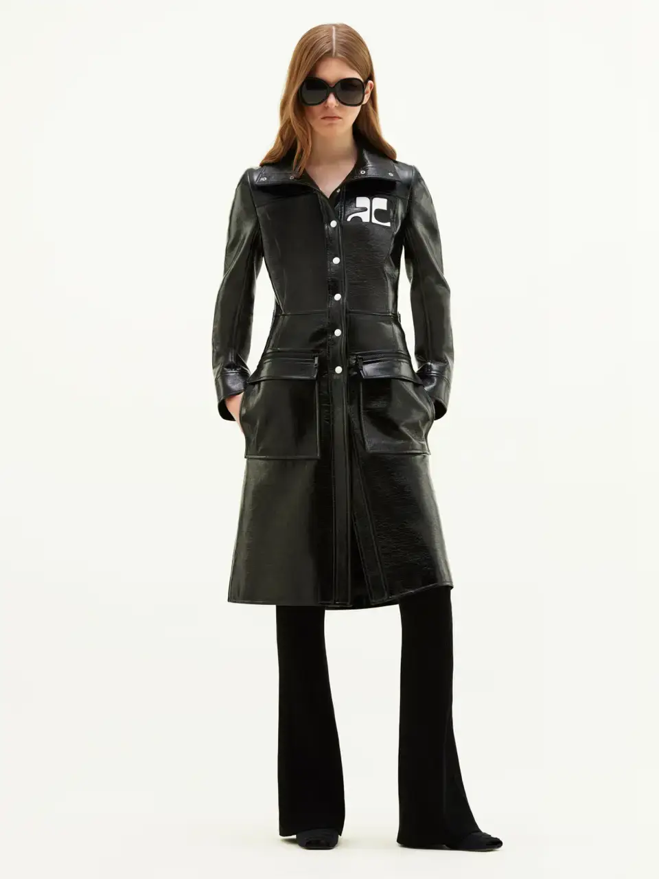 Iconic vinyl trench coat with stand-up collar, long sleeves and lined interior. Inlaid white AC logo on chest. Removable belt with zipped and patch pockets underneath. Slit at back.