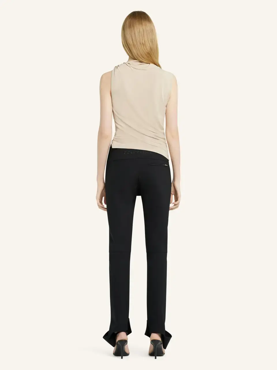 Sleeveless draped jersey top with AC logo centered at top of the chest.