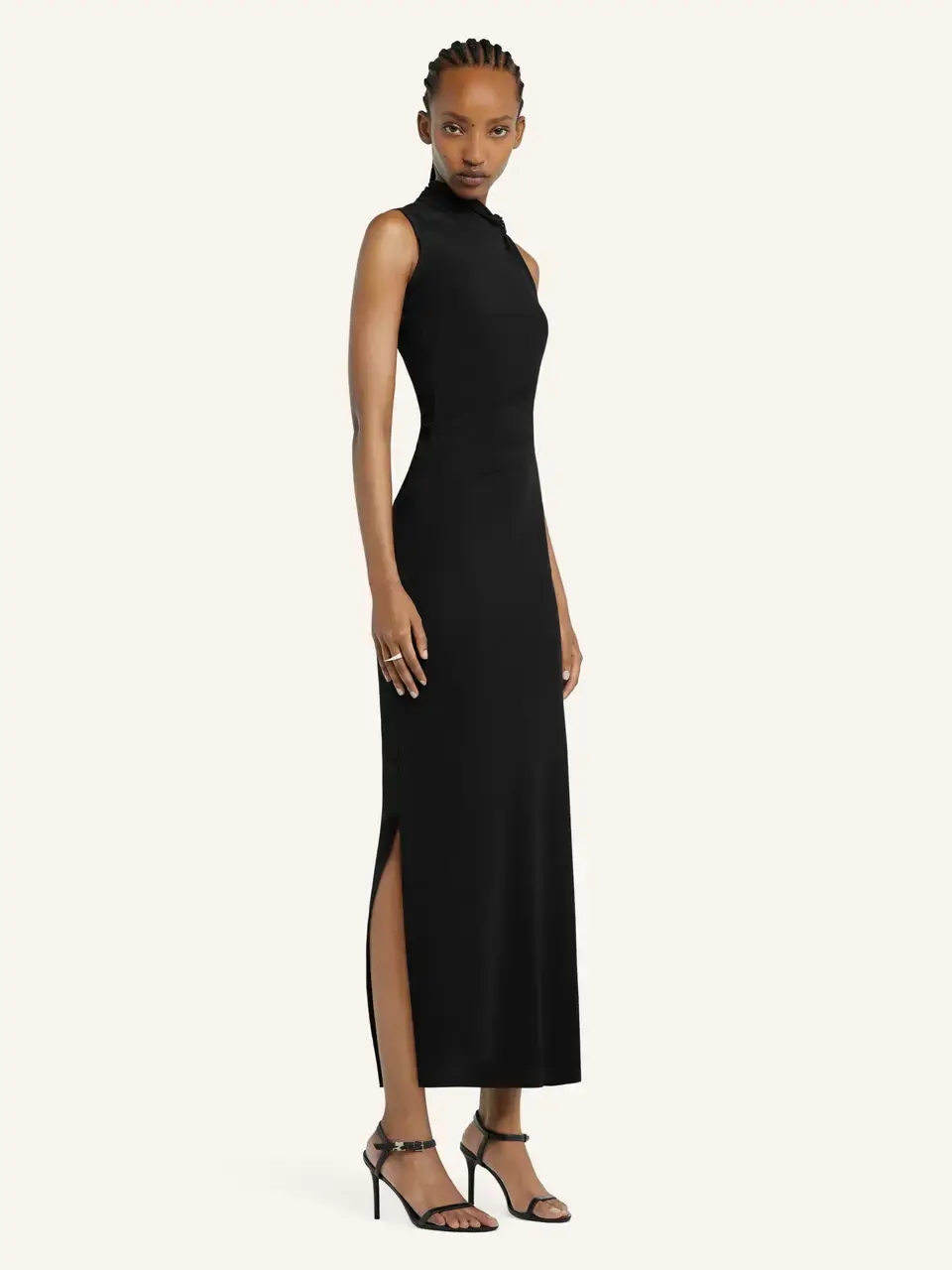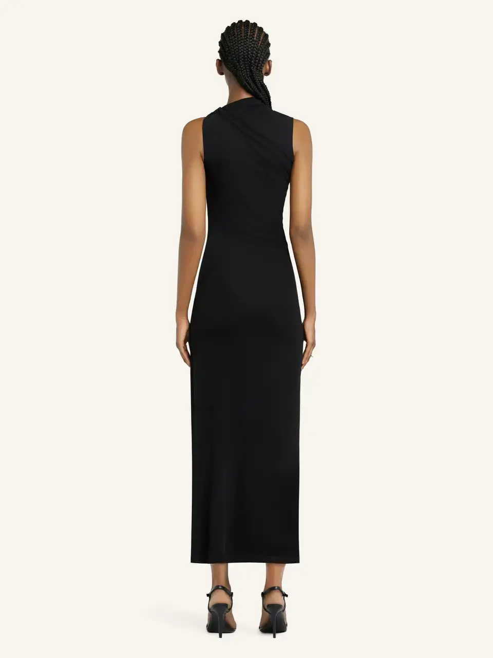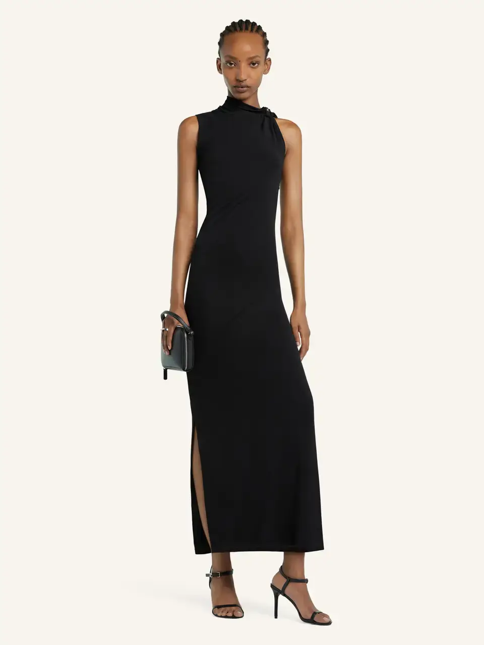 Sleeveless long dress with draped shoulder and silver AC logo. Side slit.