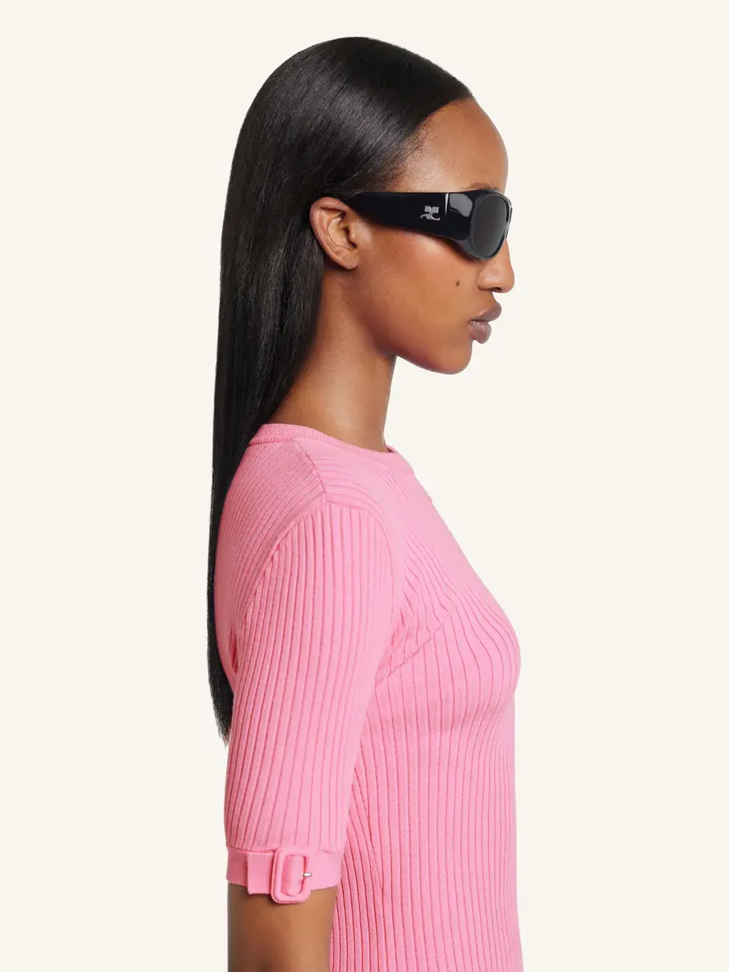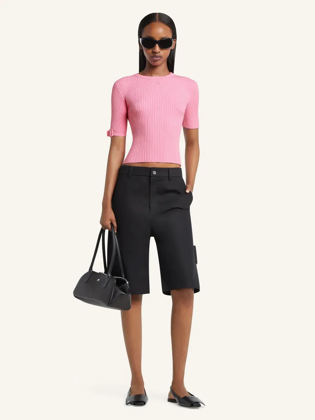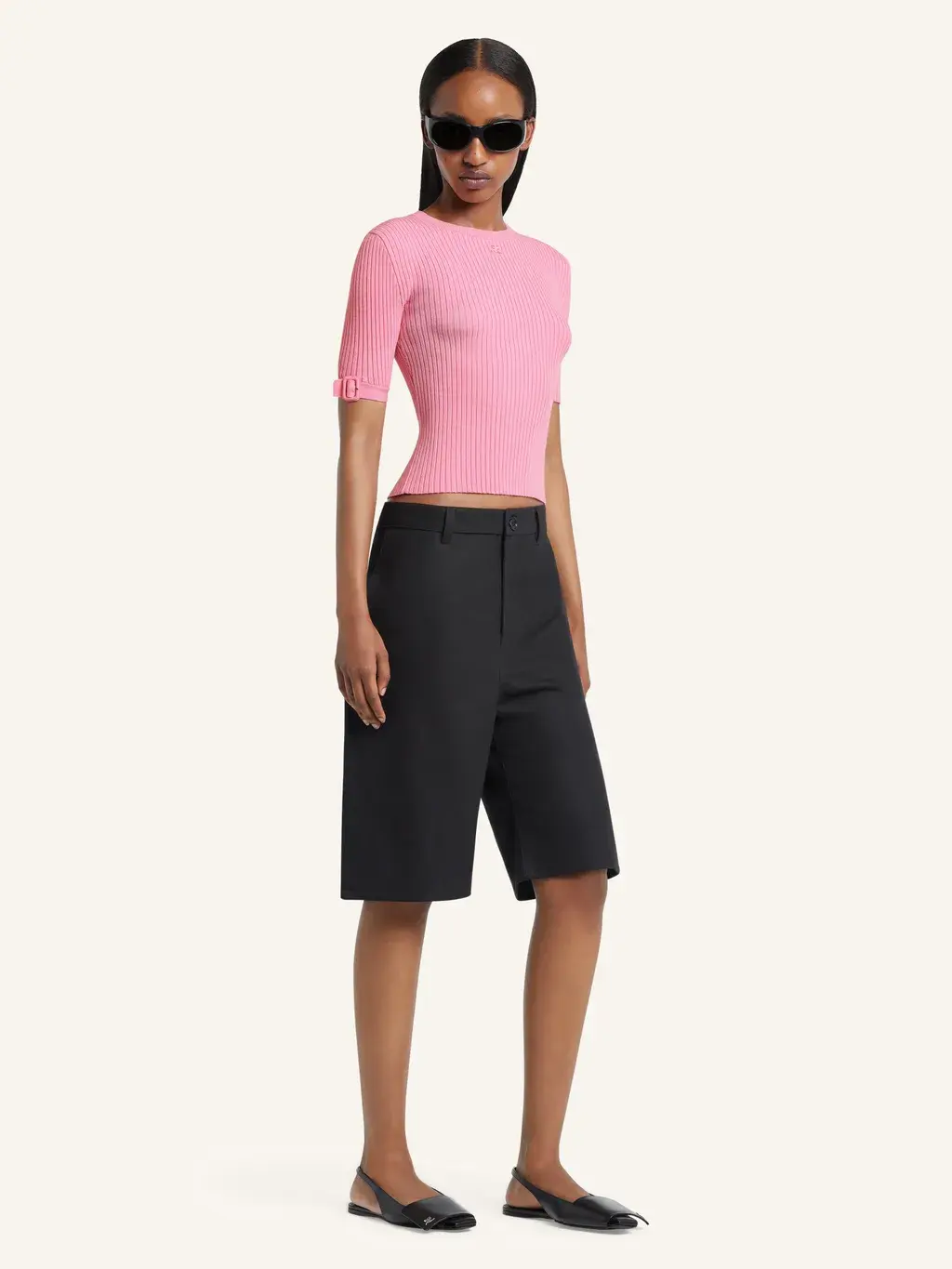 Rib-knit t-shirt with buckle detail on one sleeve and embroidered AC logo below neckline.
