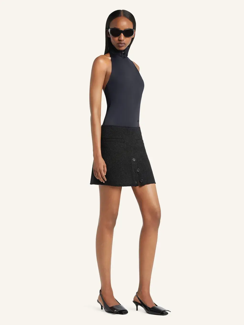 Mini tweed skirt with buttoned slit at the front and two welt pockets. Embroidered AC logo on the side.