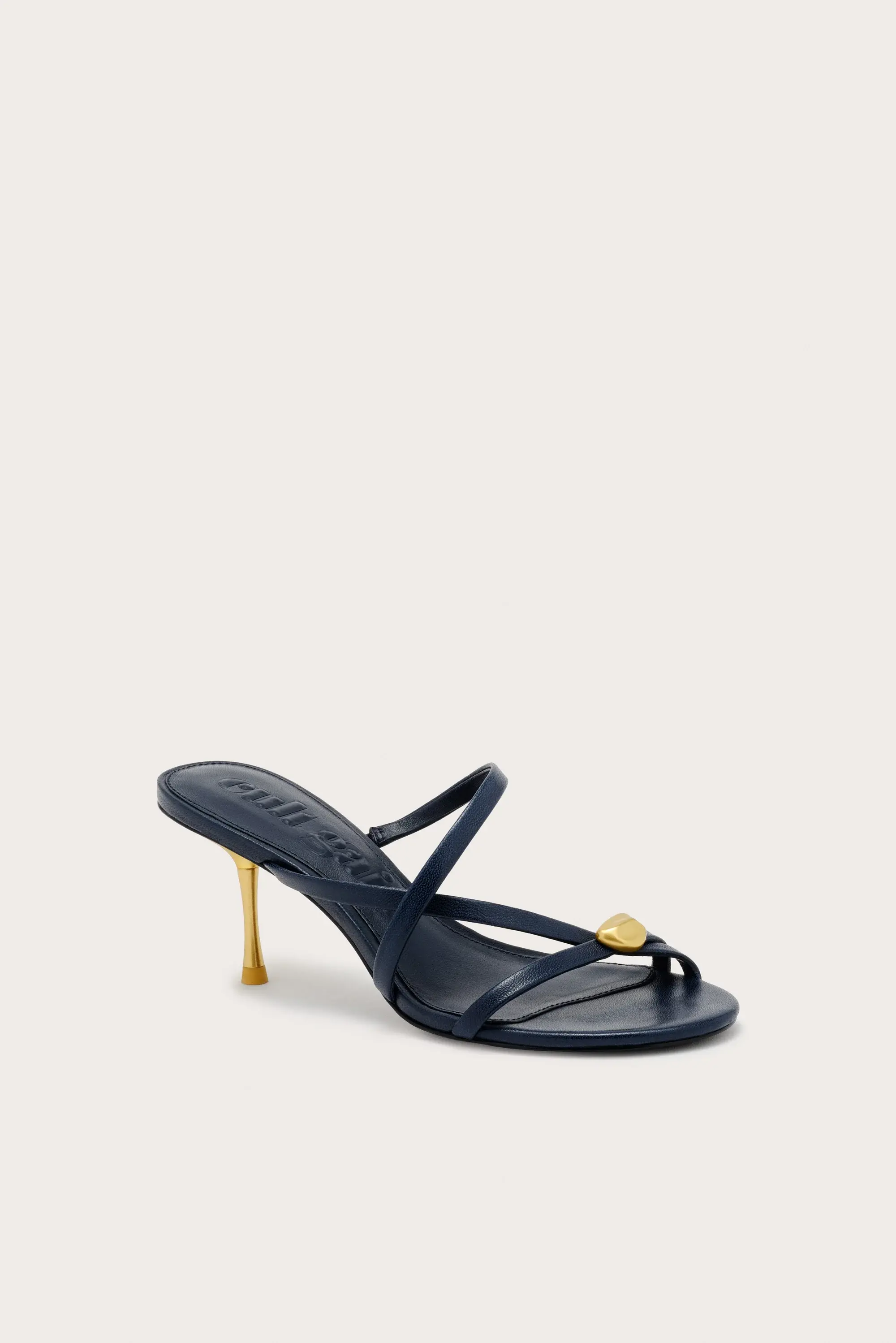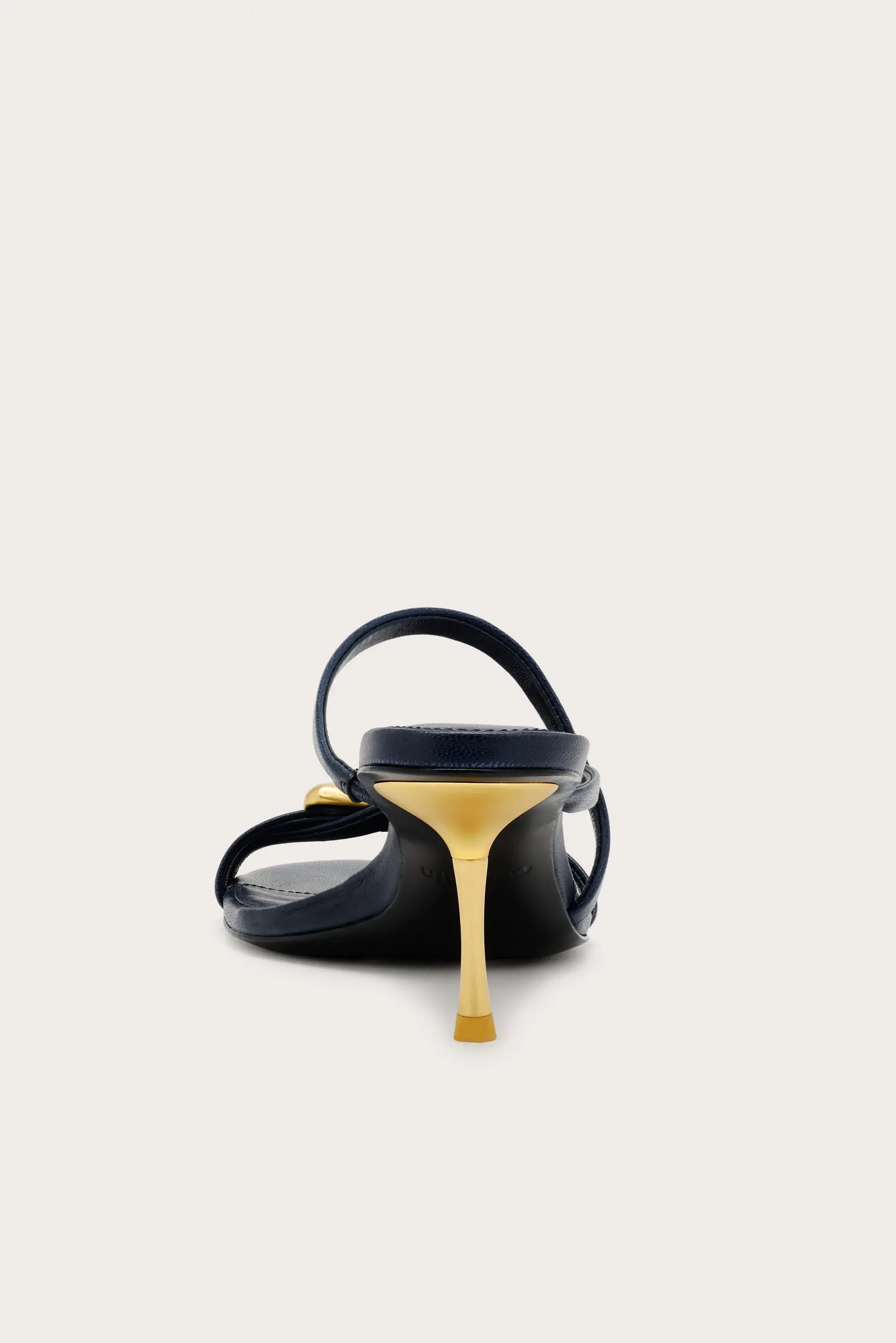 A minimalist strappy sandal defined by its asymmetric upper, signature Cleo ring ornament, and sculptural stiletto heel.