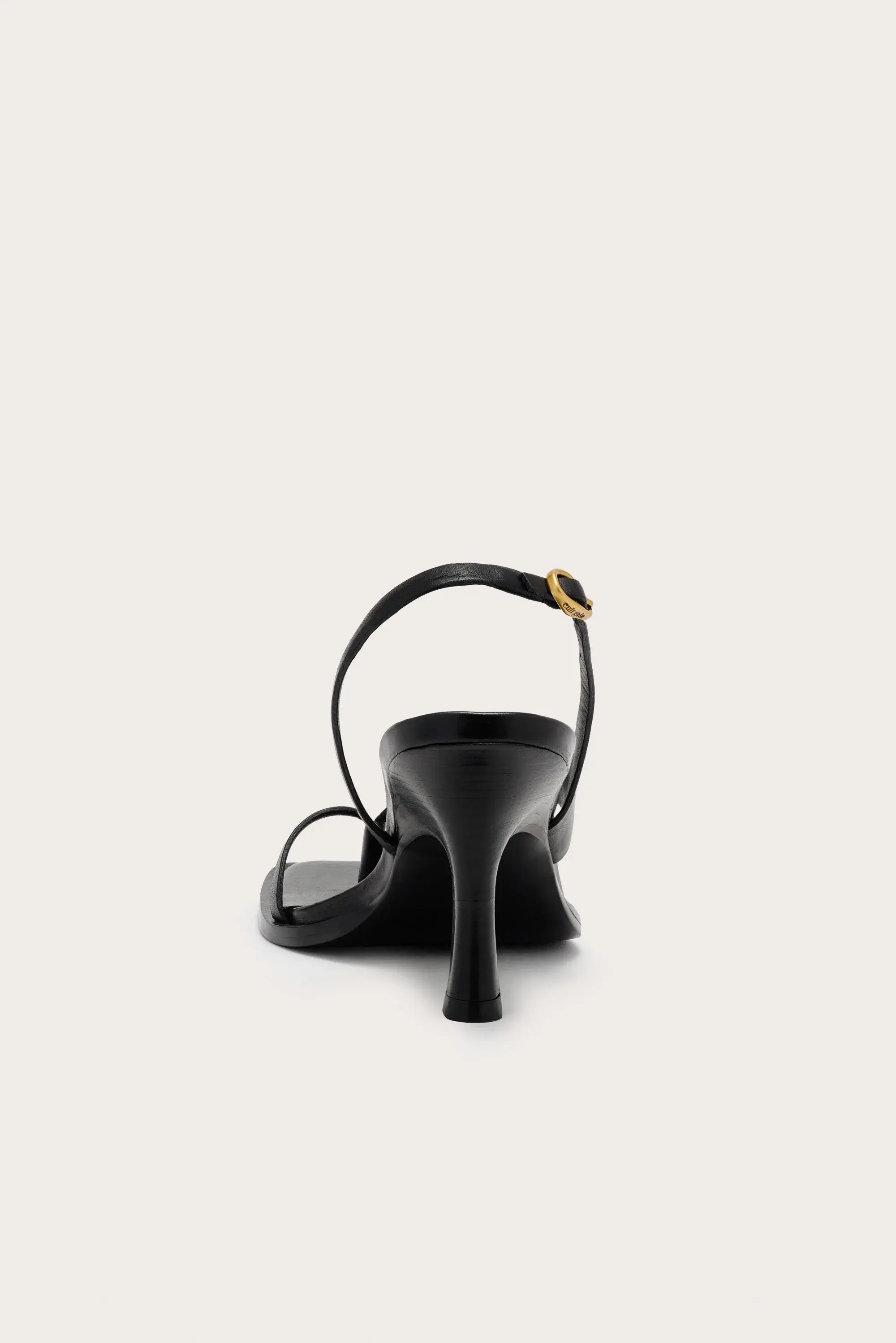 An asymmetric thong sandal designed with slim sculptural straps and a stacked leather heel.