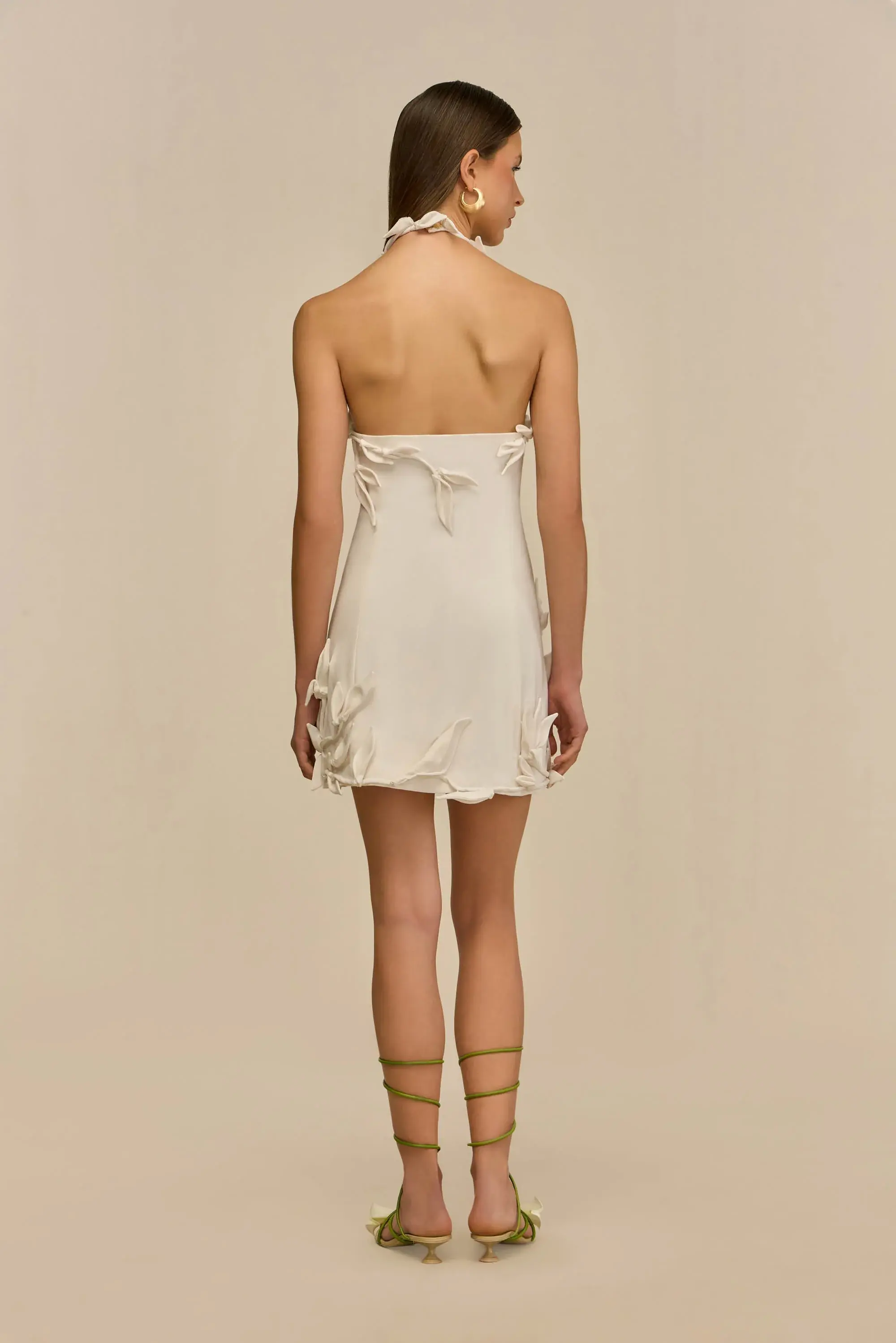 A double-crepe mini dress detailed with self-fabric calla lily appliqués that curve along the body and wrap into a halter neckline.