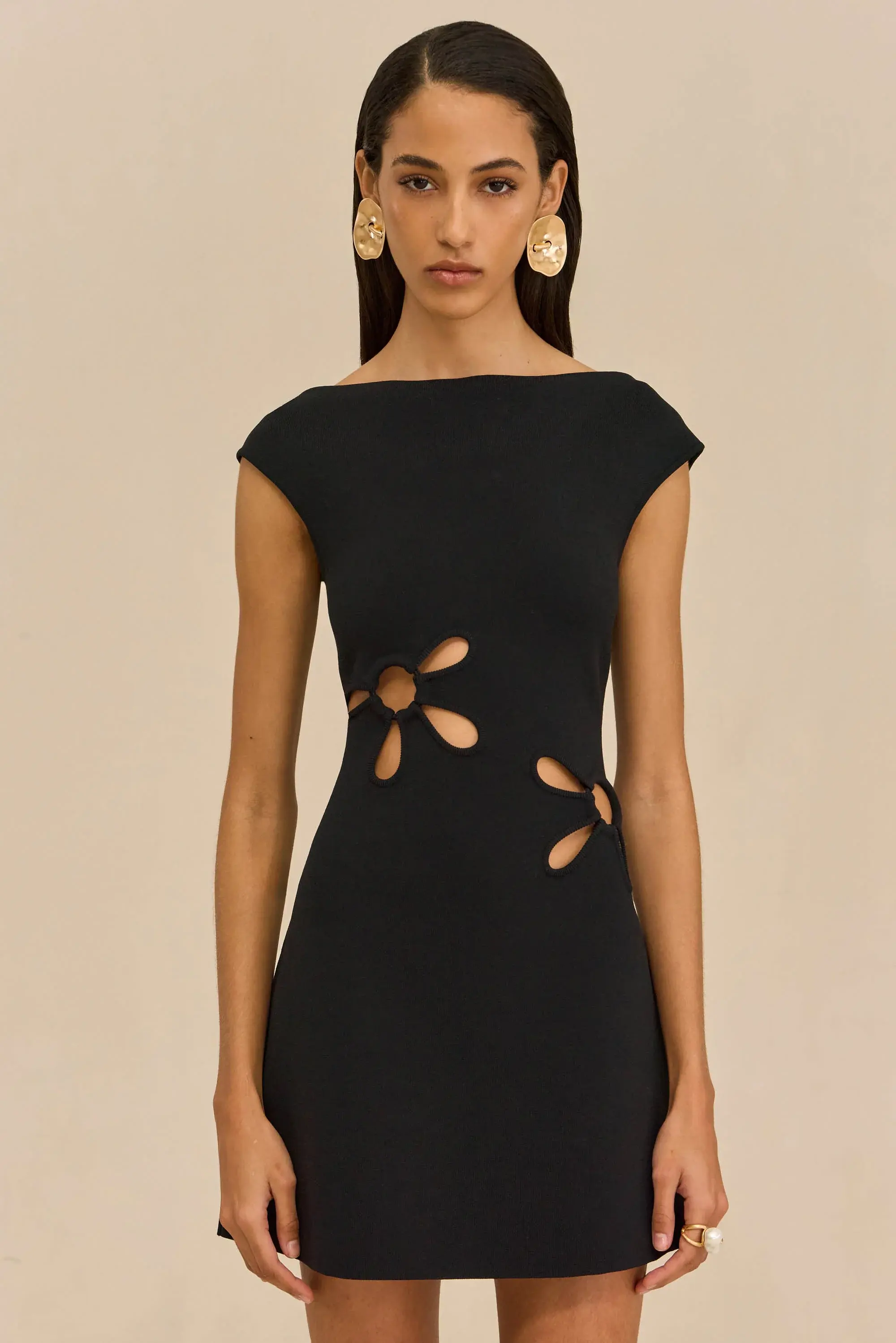 A sleek knit mini dress with artful cutouts at the front bust and waist that resemble delicate blooms.