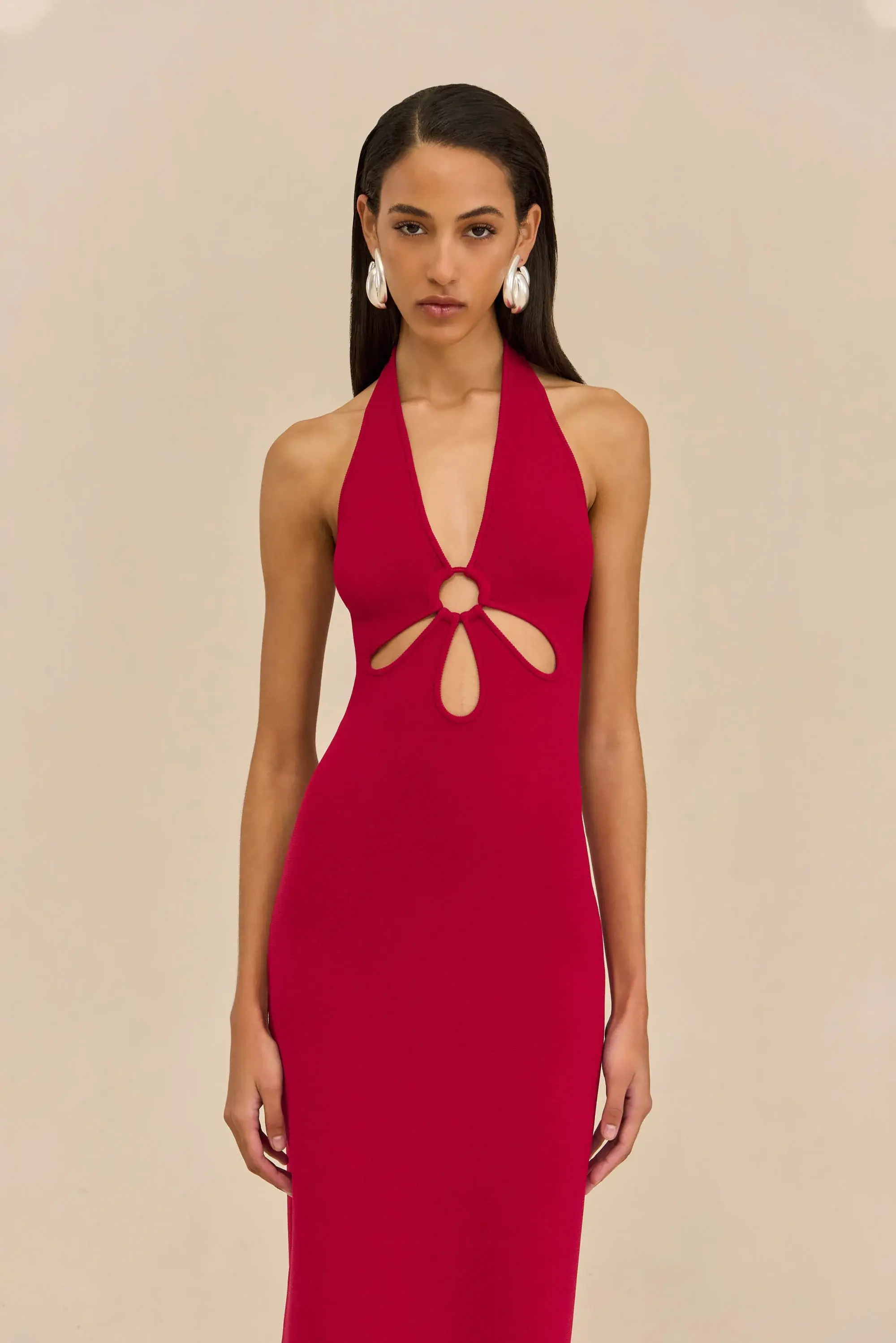 A halter knit midi dress defined by hand-covered rings and front cutouts, reimagined from our best-selling Franco Dress silhouette.