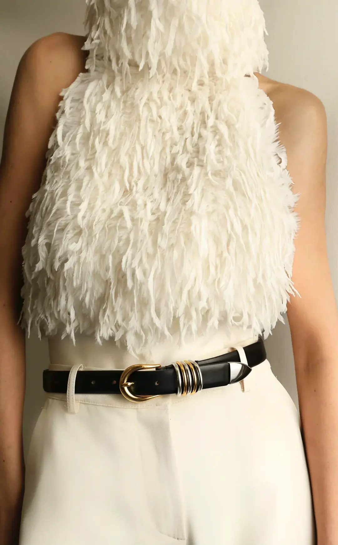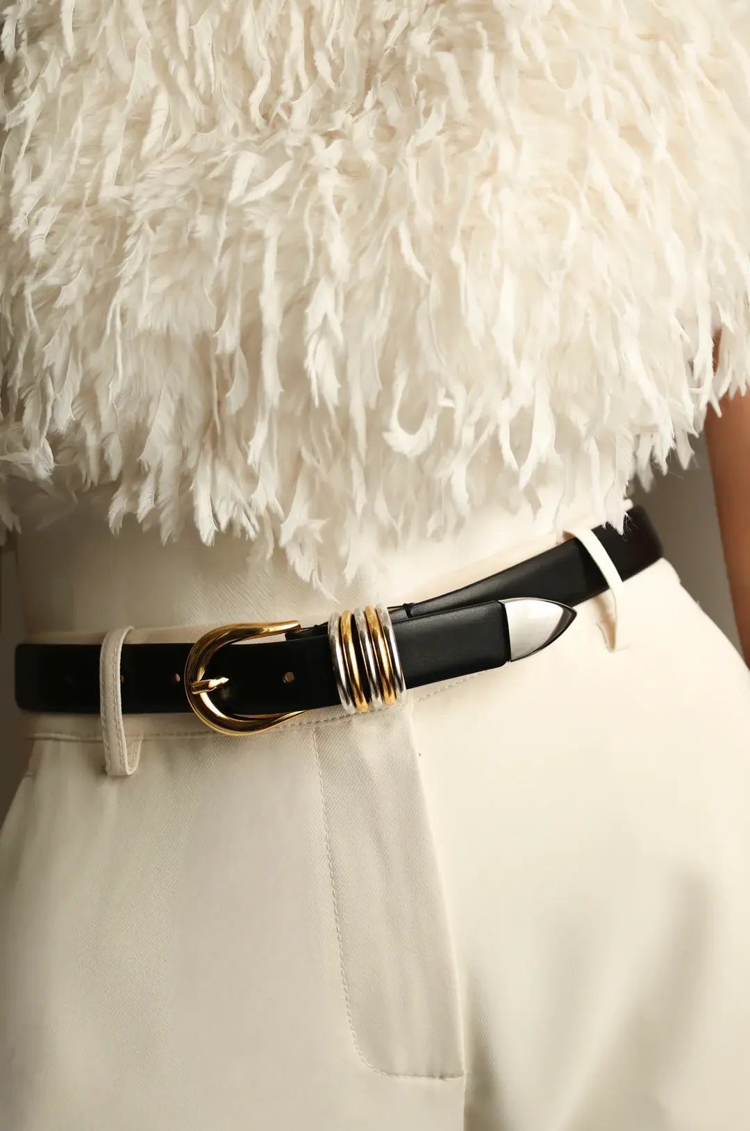 Déhanche's signature style featuring 5 rings adornments with 10 holes and an extended strap length to accommodate a broader range of sizes. Meticulously crafted from Italian leather and silver & 24K gold hardware.