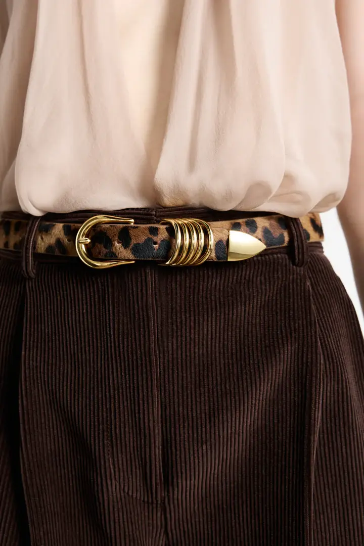 Déhanche's signature style featuring 5 rings adornments with 10 holes and an extended strap length to accommodate a broader range of sizes. Meticulously crafted from Italian printed calf hair and 24K gold hardware.