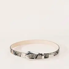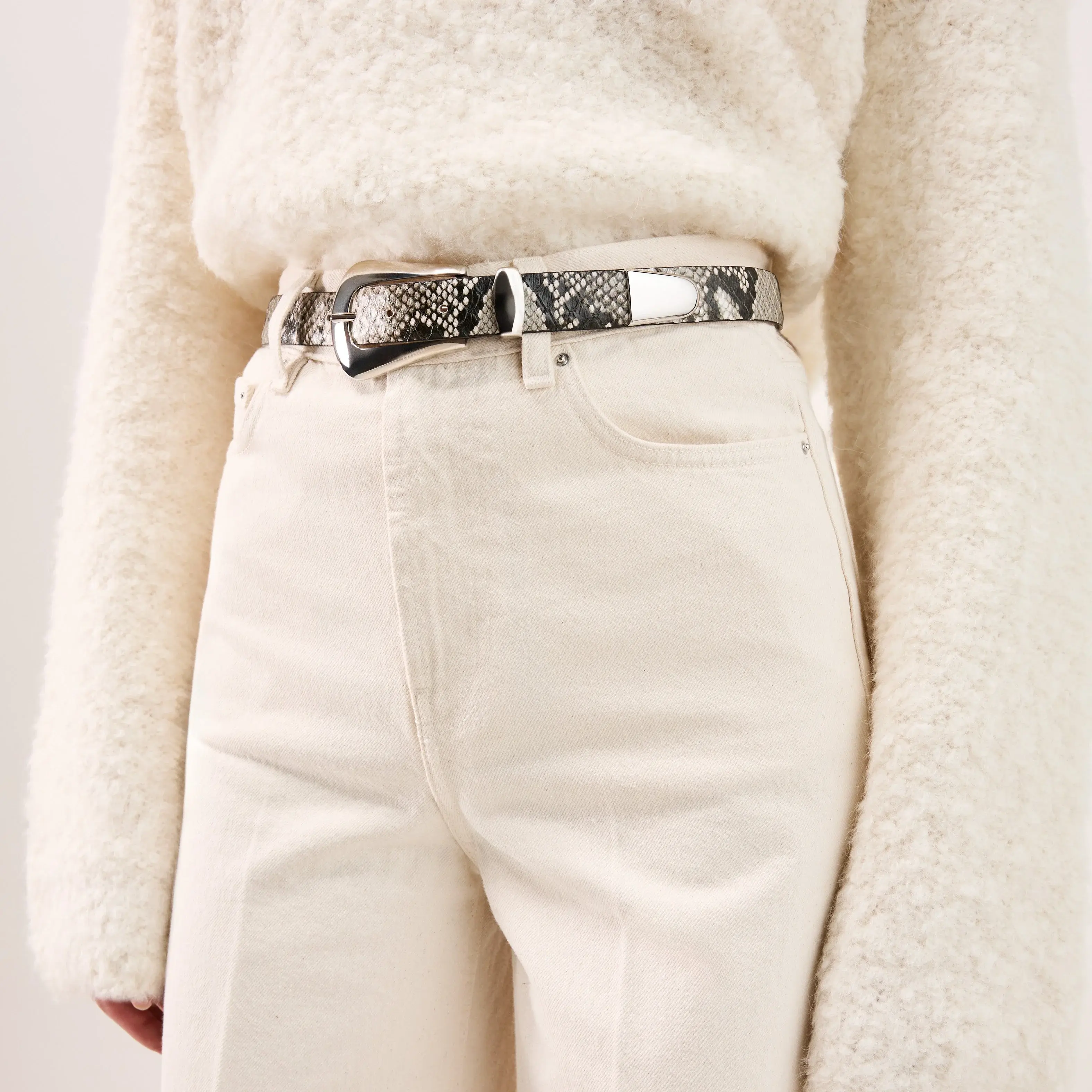 The Colette belt distills Western cues into a sculptural, minimalist accent, pairing an oval-shaped silver buckle with embossed leather for a defined silhouette.