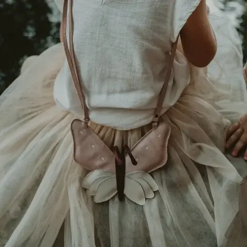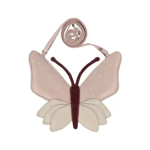 Donsje's leather bag in the shape of a butterfly. This bestseller has an adjustable strap and a zipper at the back. It measures 10 x 15 cm.