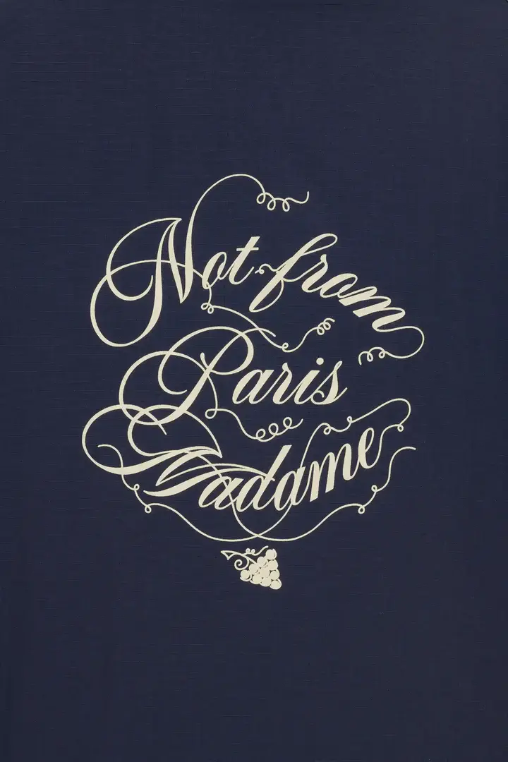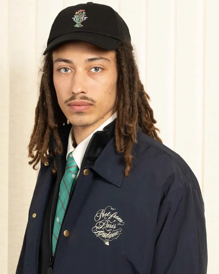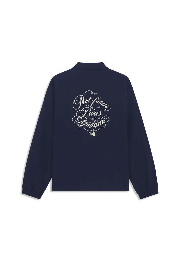 This navy ripstop jacket is printed with the Slogan Vignes pattern on the front and back. It has a loose fit, a shirt collar, two welt pockets, elasticated cuffs and five engraved snap buttons.