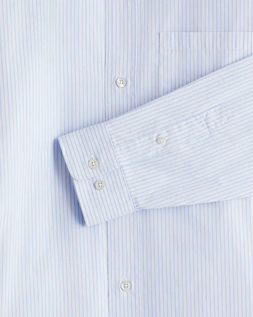 This light blue 100% cotton striped shirt has long sleeves with wrist buttons, a patch pocket on the chest with a 'Drôle' embroidery and six engraved buttons on the front.