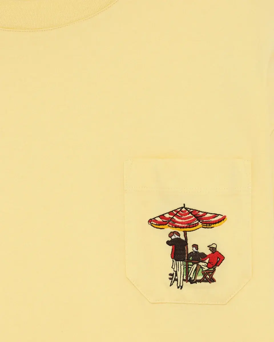 This banana 100% cotton jersey t-shirt has a chest patch pocket and a ribbed neckline. It is embroidered with the Parasol motif on the front.