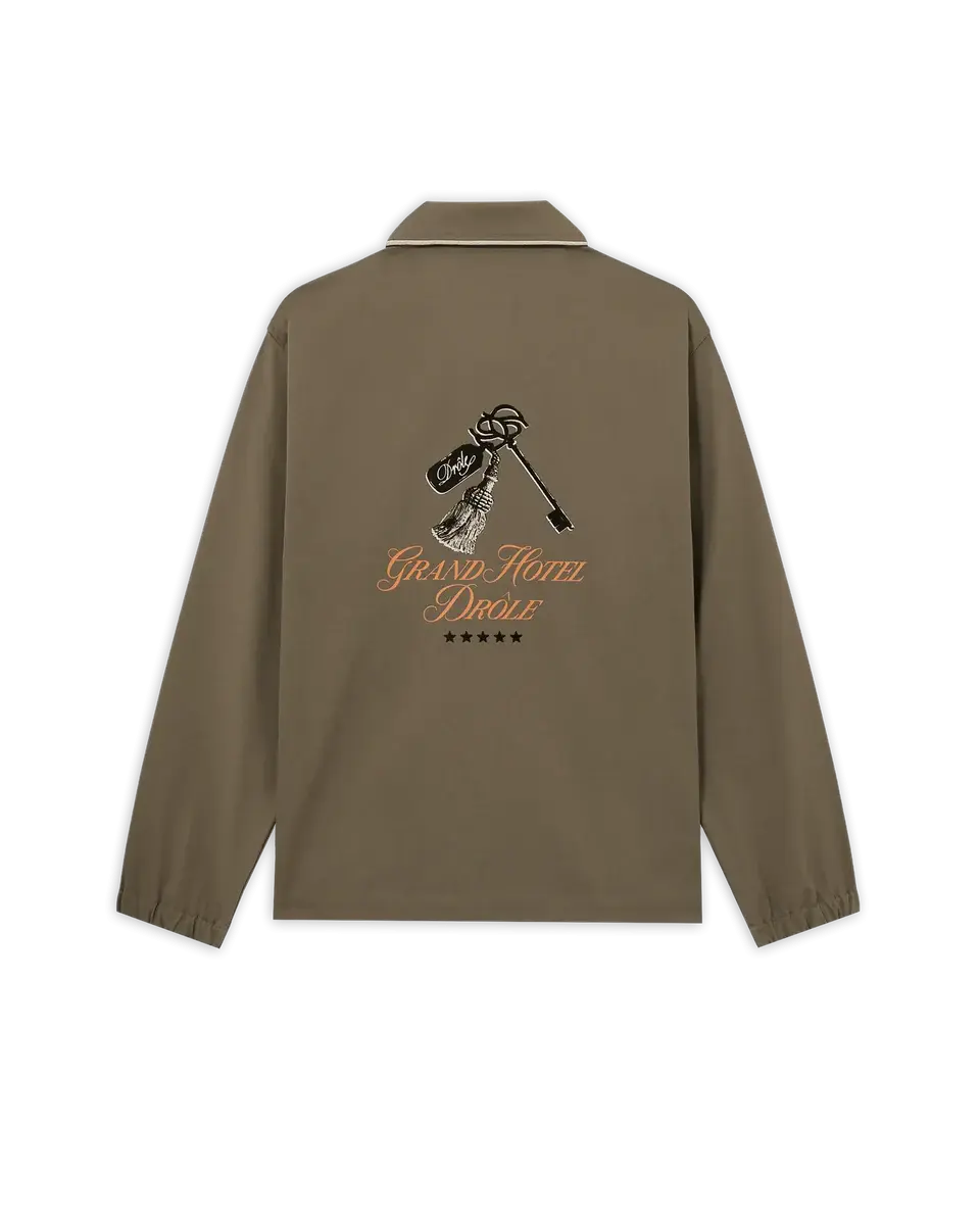 This taupe cotton overshirt-style jacket features raglan pockets with cotton piping, a shirt collar with piping, the Grand Hôtel print on the chest and back, five engraved snap buttons, and elasticated finishes at the hem and cuffs.