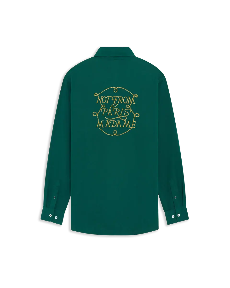 This dark green long-sleeved 100% cotton shirt is embroidered with the Slogan Tresses pattern on the front and back. It has a chest patch pocket, buttoned cuffs, seven engraved front buttons and a shirt-tail hem.