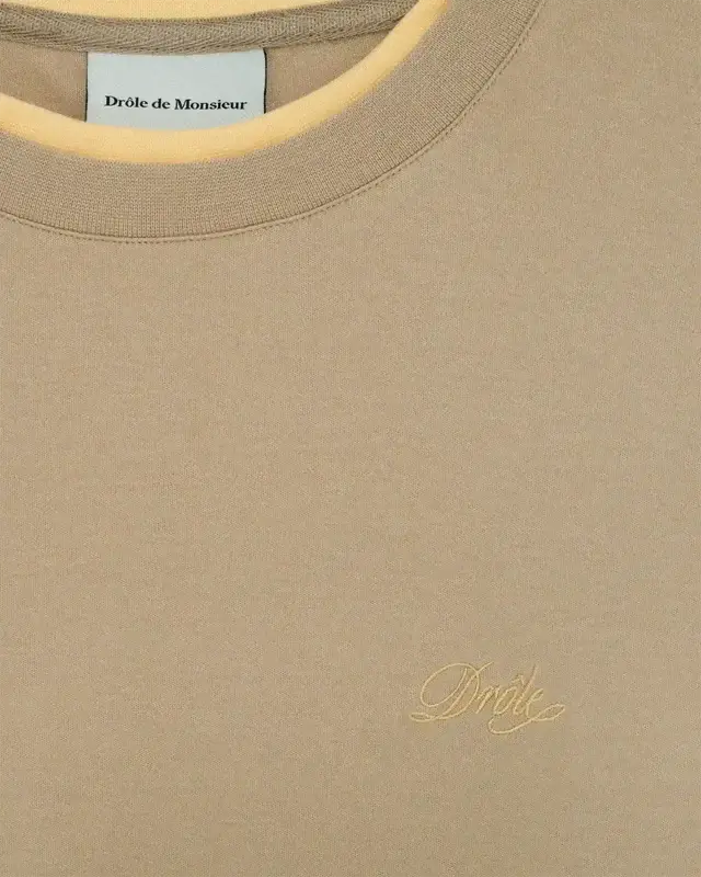 This beige t-shirt, made from 100% interlock cotton, features a layered effect with contrasting collar, cuffs, and hem. It has a 'Drôle' embroidery on the chest and a ribbed neckline.