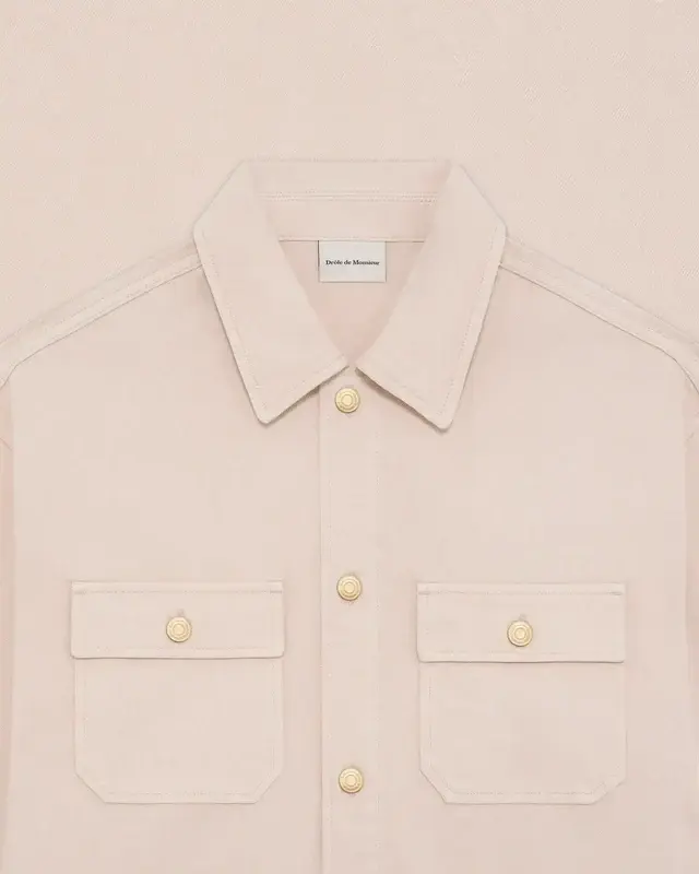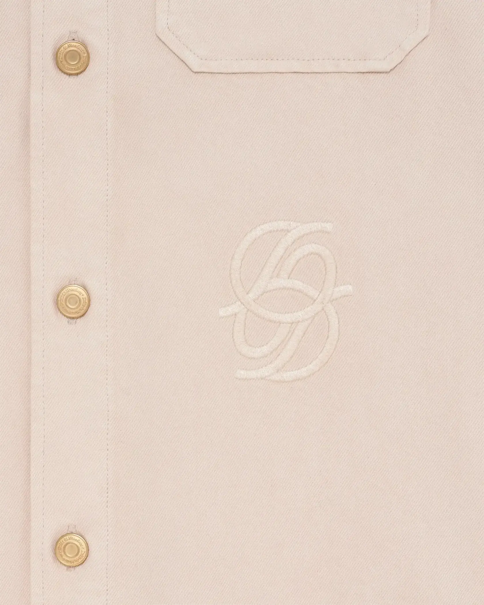 This beige 100% cotton denim shirt features two chest flap pockets with denim buttons, five front denim buttons, a tonal mirrored 'D' embroidery under the chest pocket, and fitted cuffs.