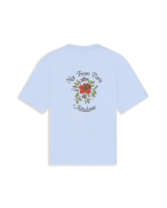 This light blue 100% cotton interlock t-shirt with a ribbed neckline features the Slogan Rose print on the front and back.