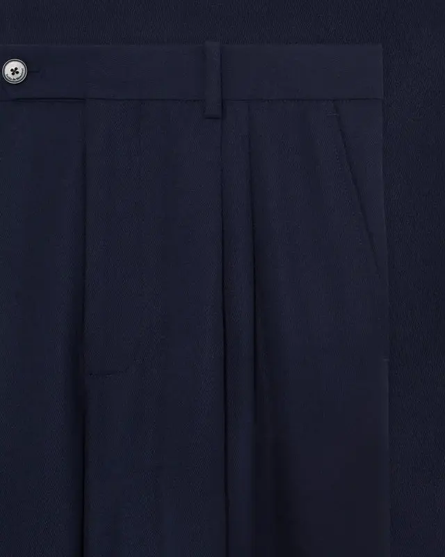 Made from a wool blend, these navy cropped 2-pleat trousers with cuffs feature two Italian pockets, two buttoned welt pockets at the back, a personalized waistband, a zip and button closure, and a Drôle Tresse patch on the back waistband.