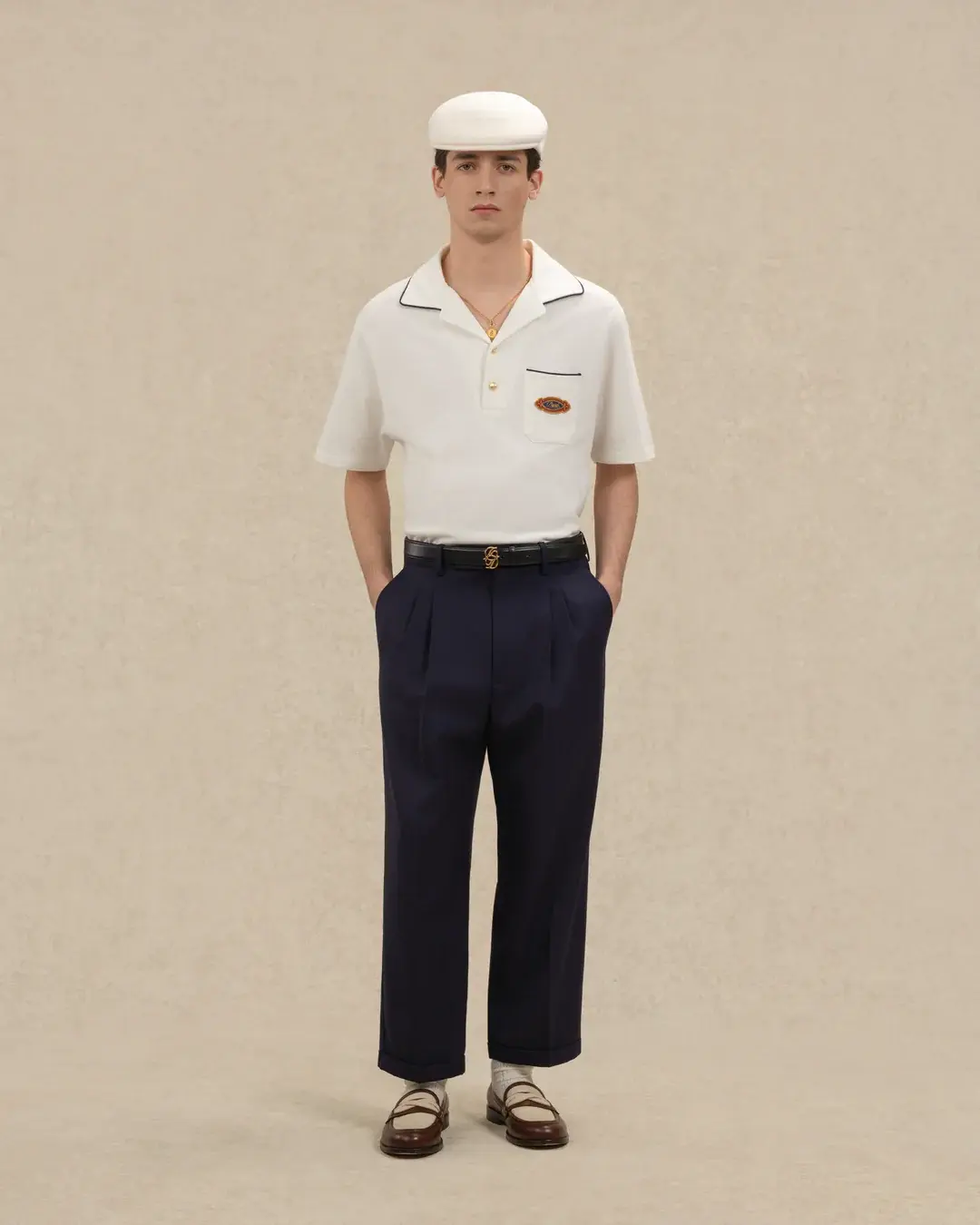 • Cropped 2-pleat trousers with cuffs • 2 Italian pockets • 2 buttoned welt pockets at the back • Personalized waistband • Zip and button closure • Drôle Tresse patch on the back waistband • 45% virgin wool and 55% polyester