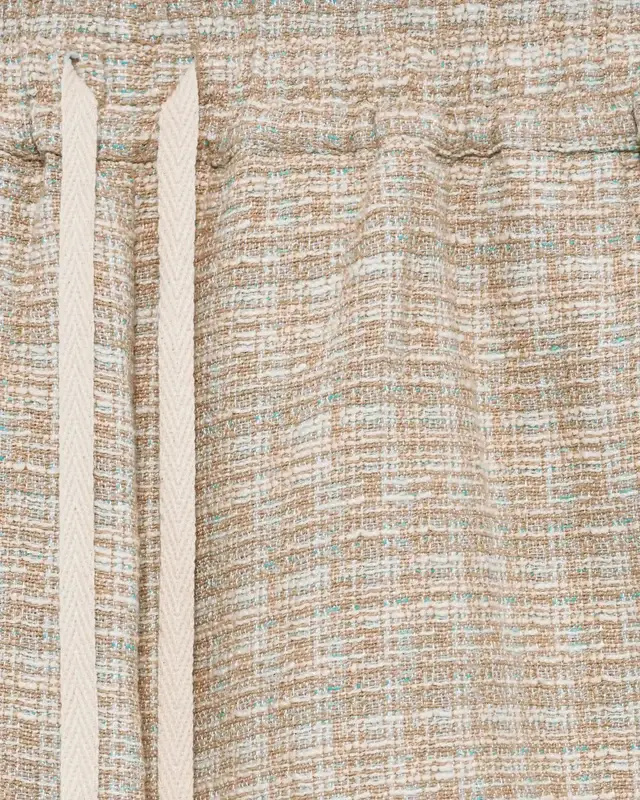 Made from a cotton blend, these dark beige tweed shorts feature a two-tone side trim. They have an elasticated waistband, cotton drawstrings with embossed leather tips, two front Italian pockets, and one welt pocket at the back.