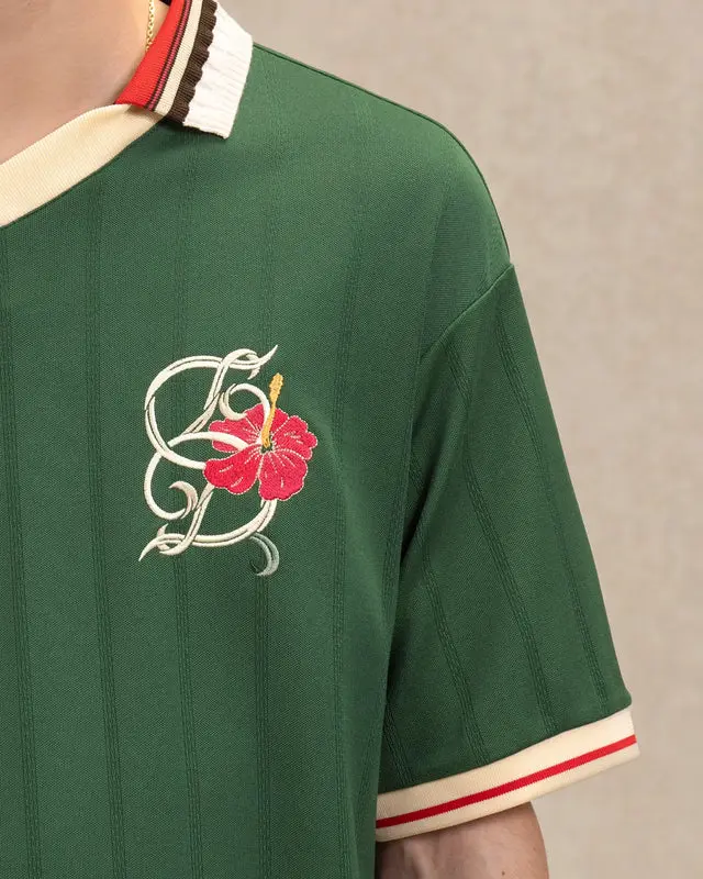 This dark green short-sleeve polo shirt in a cotton blend features a mirrored 'D' Hibiscus embroidery on the chest. It has a double V-neck with a shirt-style collar, as well as a ribbed collar and sleeve cuffs.