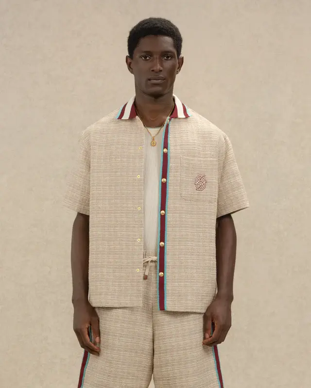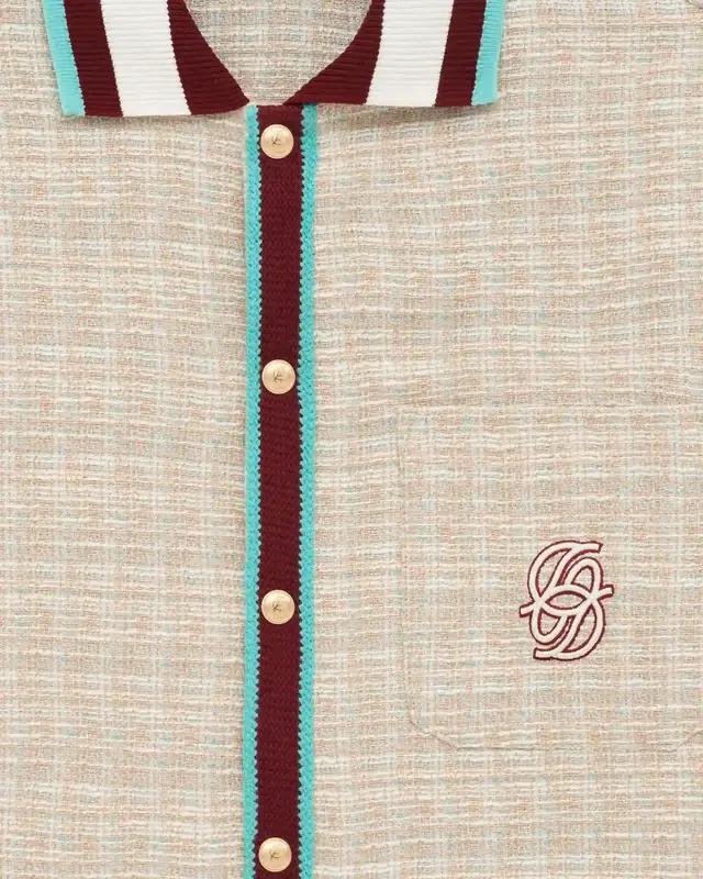 • Short-sleeved shirt • Ribbed shirt collar • Single-breasted 5-button closure • Contrasting inserts on the button placket • 54% cotton, 27% viscose, 12% acrylic, 5% other fibers, 1% polyester, and 1% polyamide