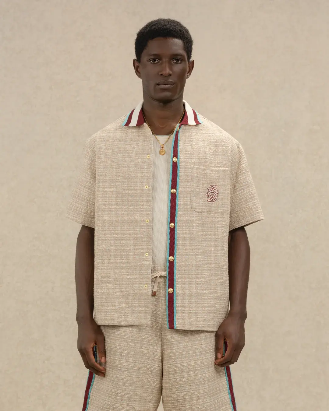 Made from a cotton blend, this dark beige short-sleeved shirt features a ribbed shirt collar, a single-breasted five-button closure, and contrasting inserts on the button placket.