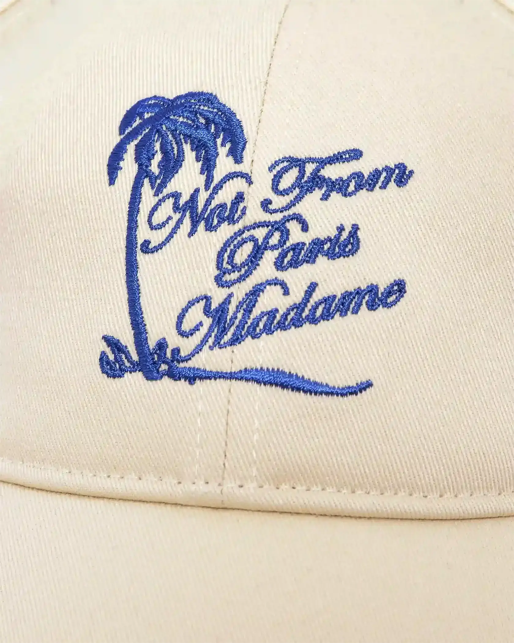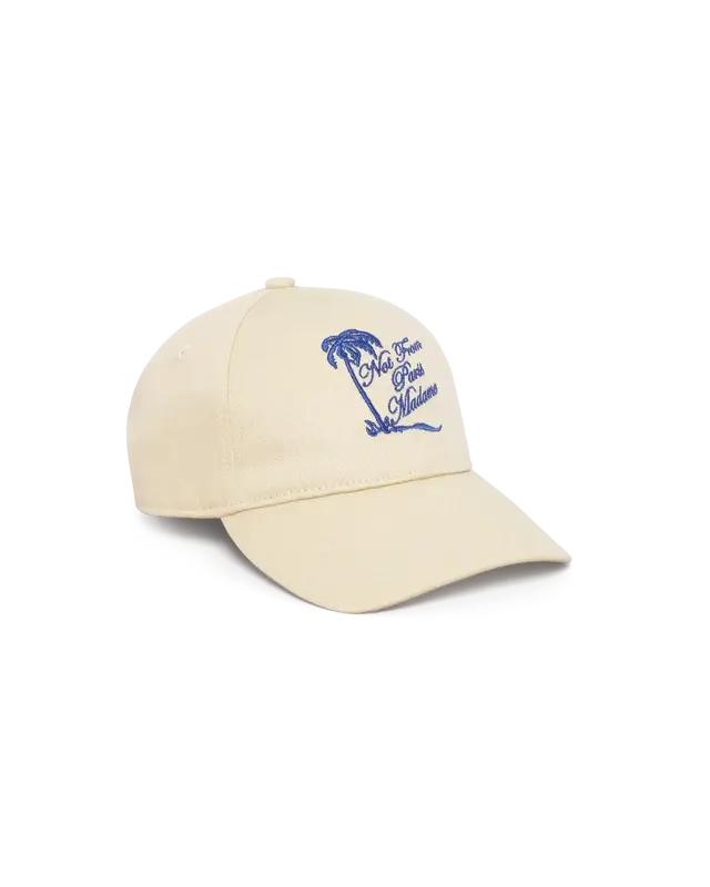 Made from 100% cotton, this off white 6-panel cap features a rounded visor, a Slogan Palmiers embroidery on the front, a 'Drôle' label sewn on the back, and an adjustable back strap with a metal buckle.