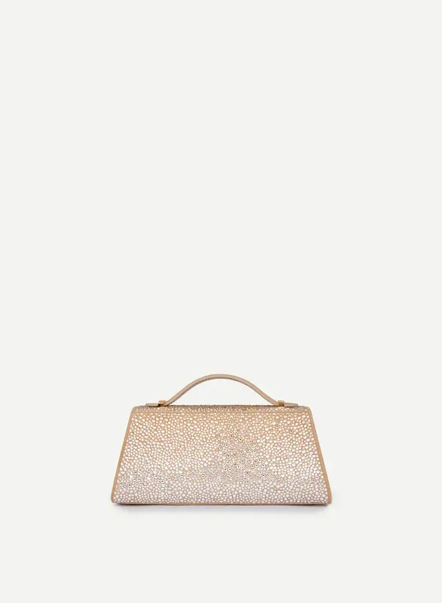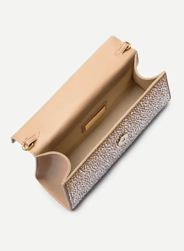 Timeless sophistication meets modern allure. This exquisite piece is crafted from the finest champagne embellished leather and adorned with Swarovski crystals. Expertly made in Italy, every detail reflects meticulous craftmanship, effortlessly elevating any ensemble. This unique design is the quintessential companion, making a statement at every occasion.