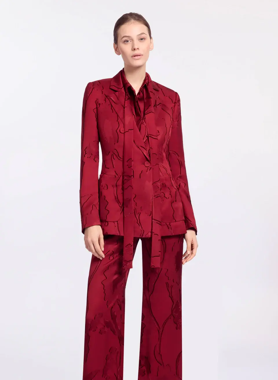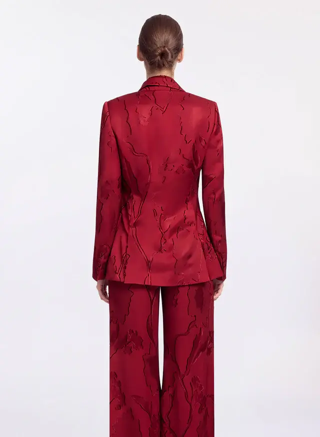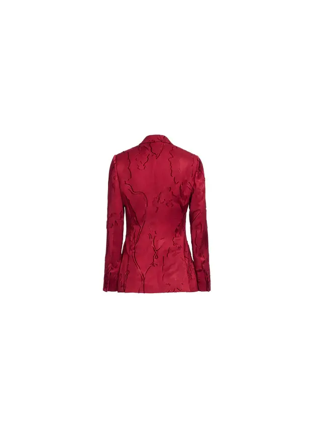 Sharp and tailored, this Luscious Red jacquard blazer features a double-breasted front, structured shoulders, and a sharp collar and lapel. Patch pockets and buttoned cuffs complete the look, an elevated piece for bold daywear. Wear with matching pants for a striking coordinated ensemble.