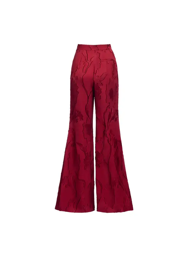 Elegant and flattering, these Luscious Red jacquard pants feature a high-rise waist and flared silhouette. Slash pockets and a welt pocket add practical detail. Wear with matching shirt and jacket for a coordinated daywear ensemble.