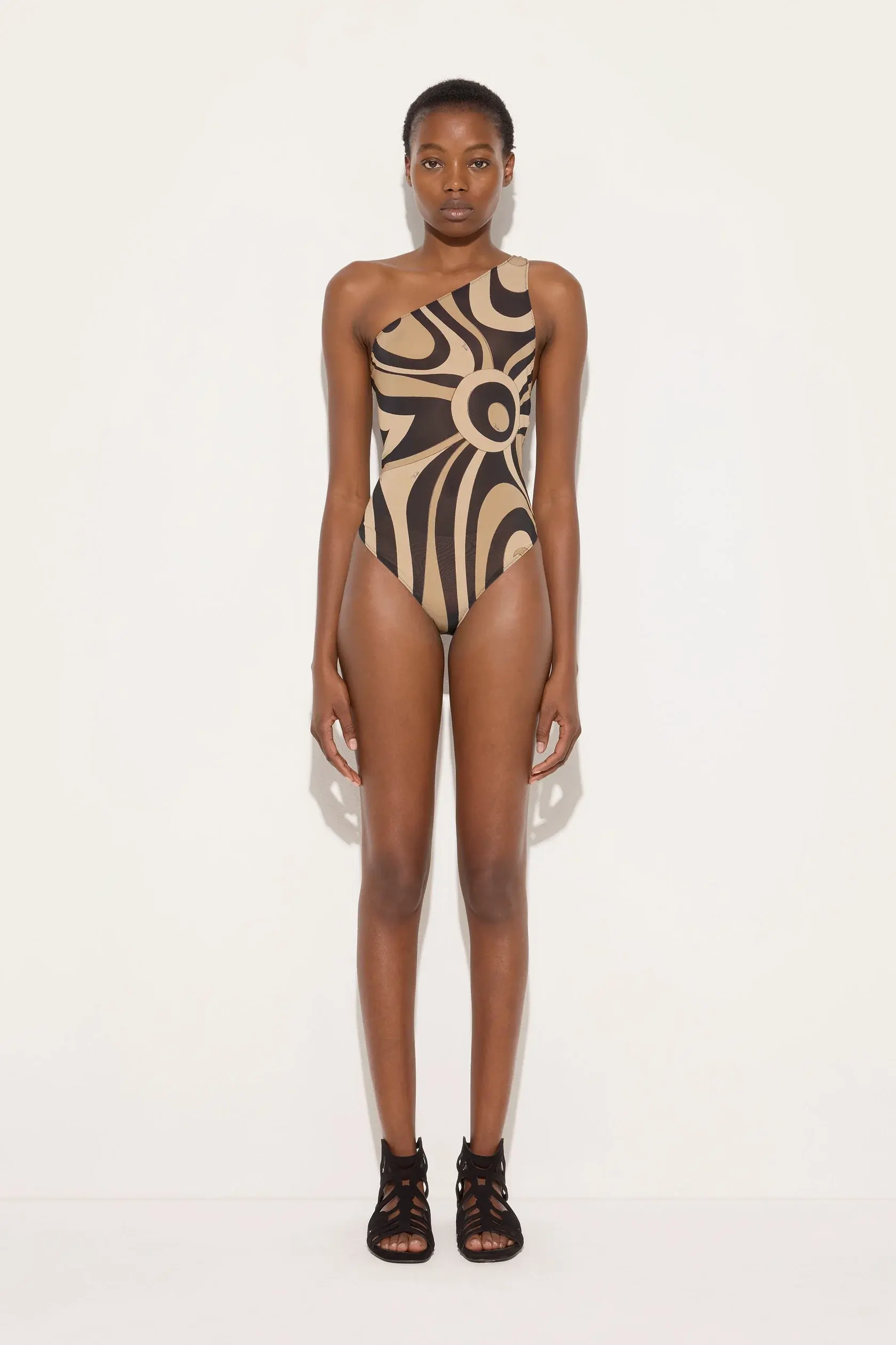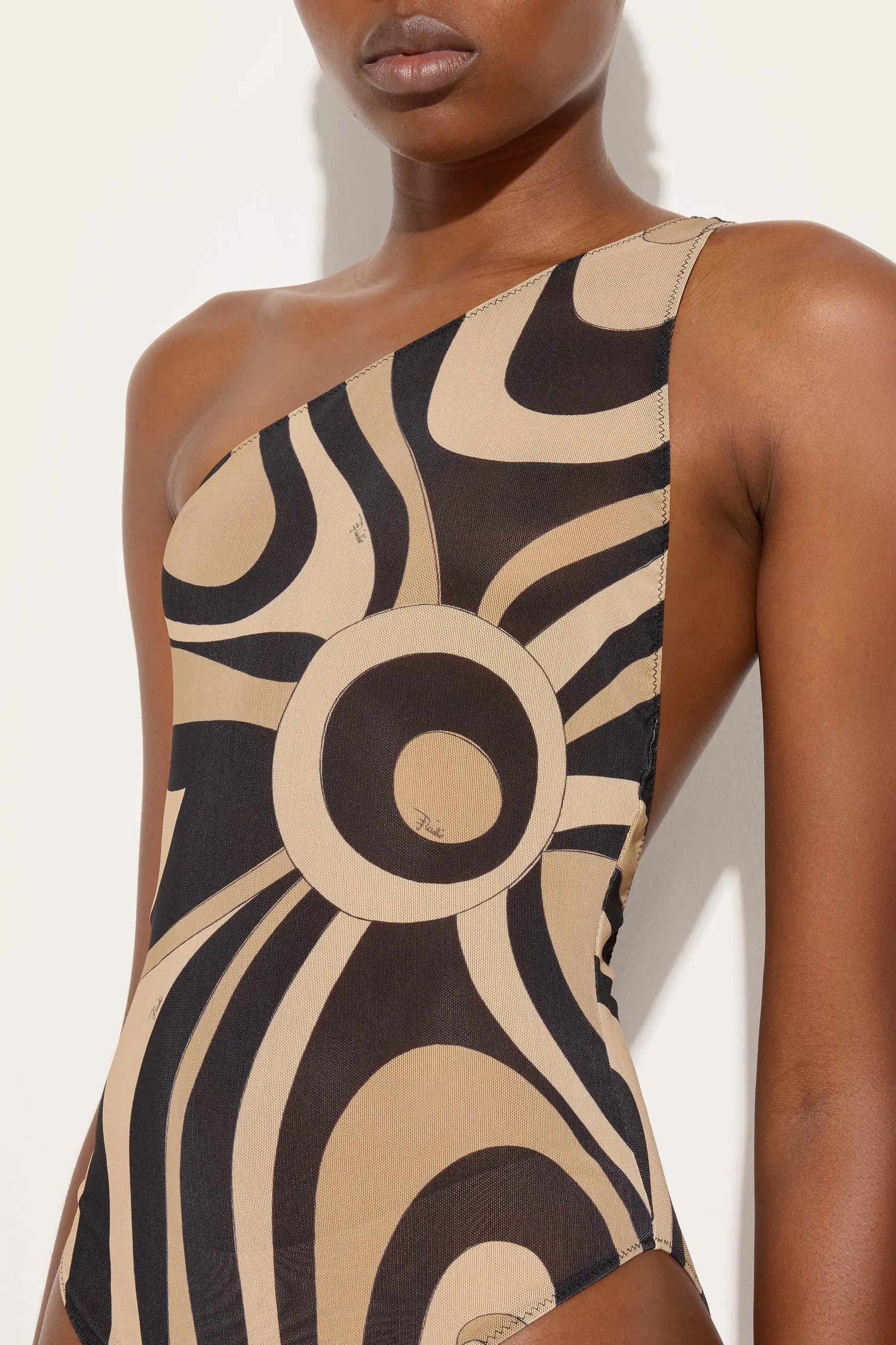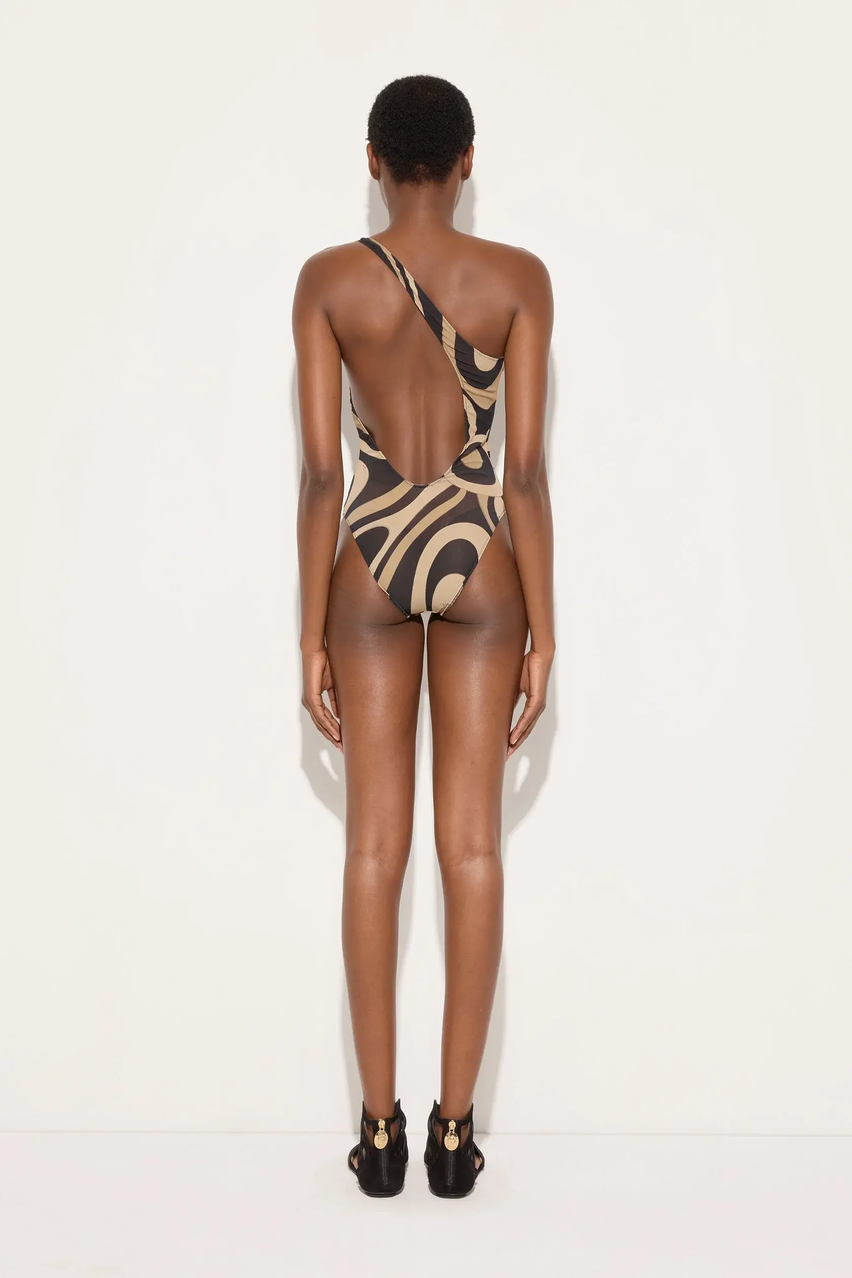 A bold bodysuit that combines sheer fabrics and bold lines. The one-shoulder design creates an asymmetrical, contemporary silhouette, while the plunging back adds a sensual, dynamic contrast. The stretch mesh lightly wraps around the body, allowing the beige and black Marmo print to emerge as a fluid pattern. A calibrated balance between structure and movement, designed for a beach look with a strong visual impact.