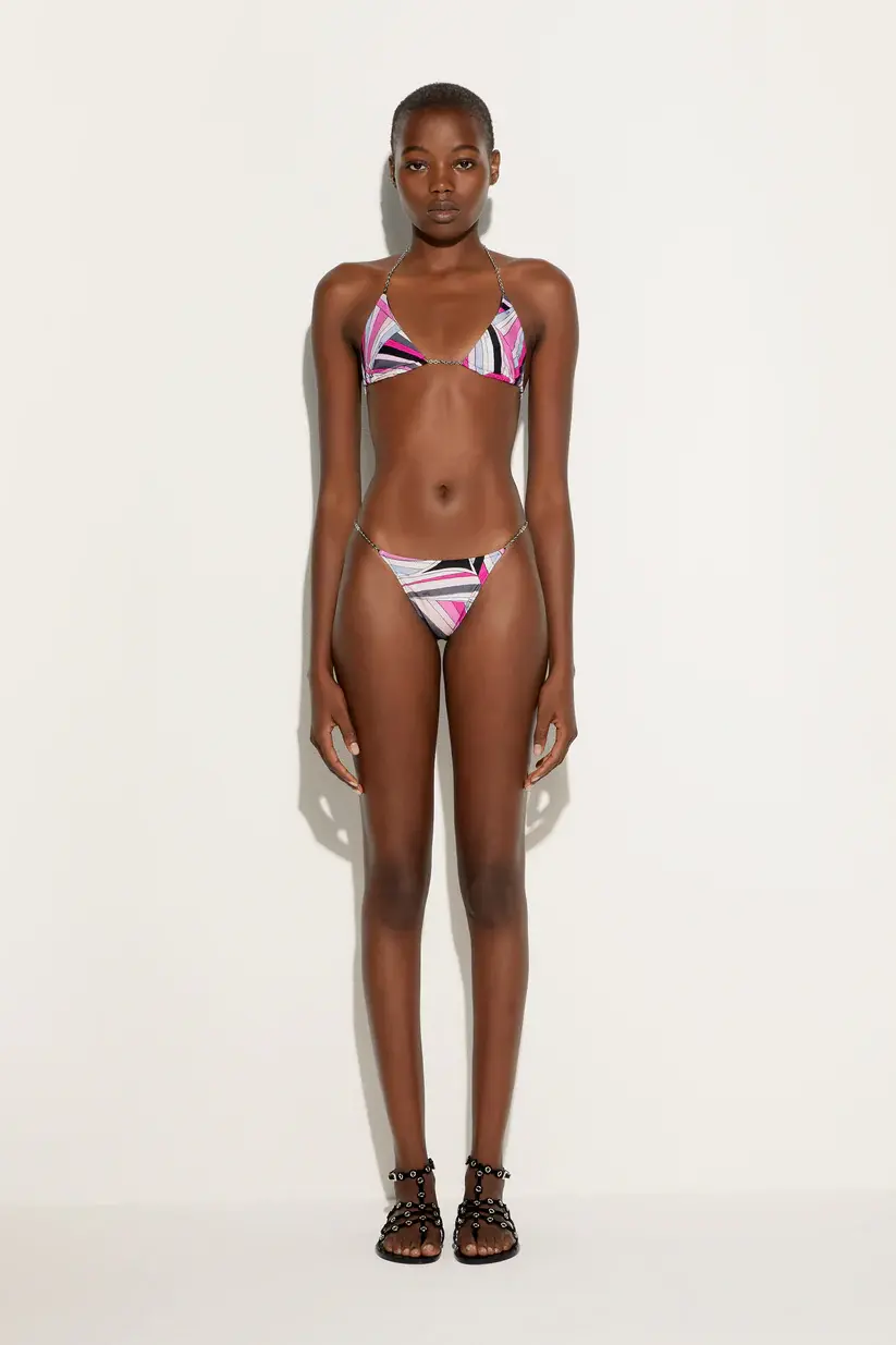 A perfect mix of sensuality and precious details. This triangle bikini top is embellished with metal chain ties, which add a sophisticated touch to the essential design. Made of stretch lycra with anti-UV treatment, it ensures a comfortable fit and extra protection under the sun.The Iride print in shades of black and fuchsia gives a graphic and vibrant appeal, emphasizing the distinctive character of the Pucci world. A garment that does not go unnoticed, perfect for those who like to combine elegance and modernity even at the beach.