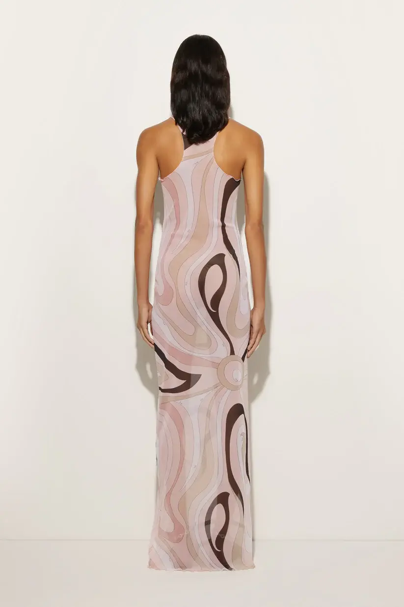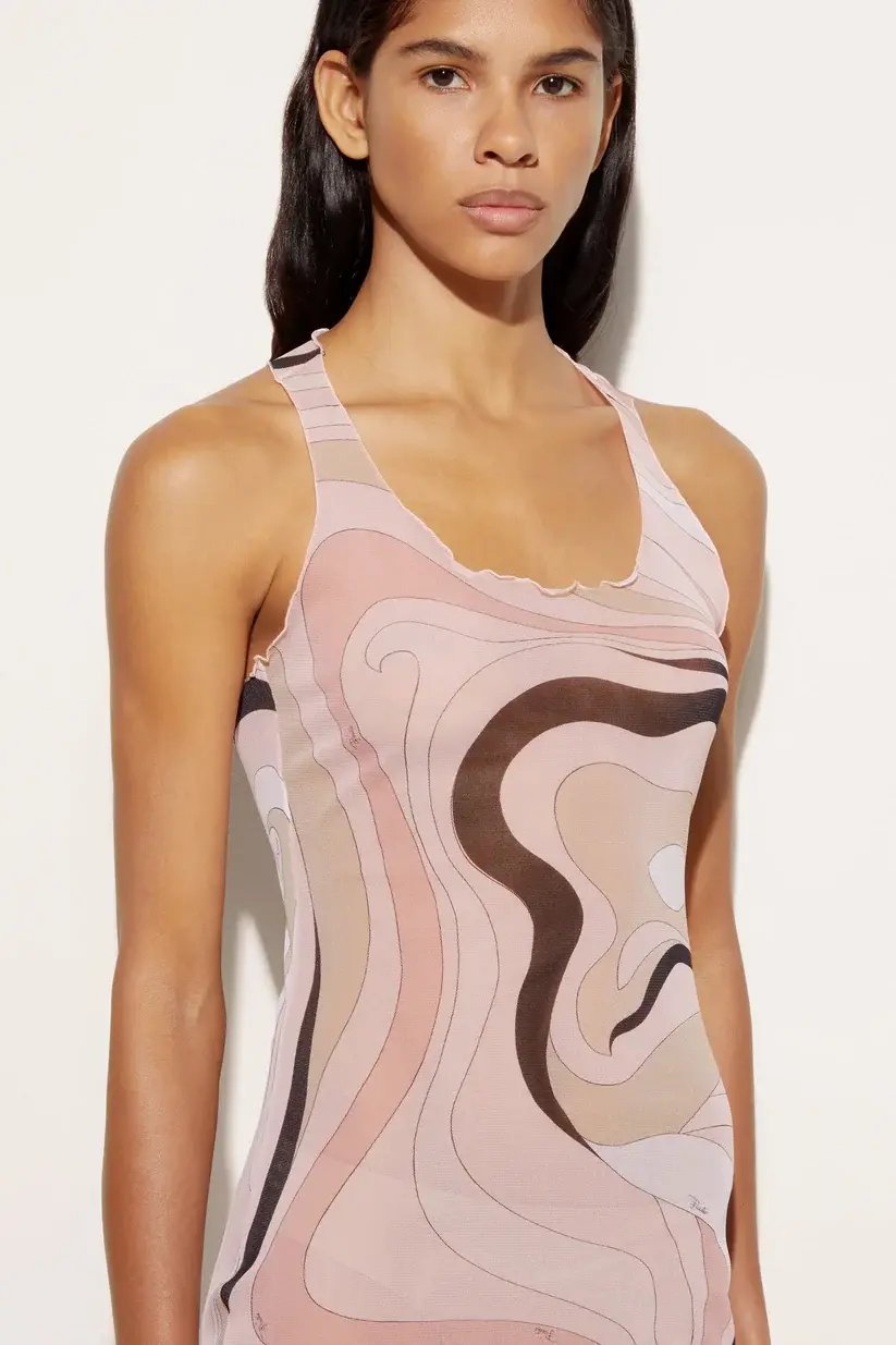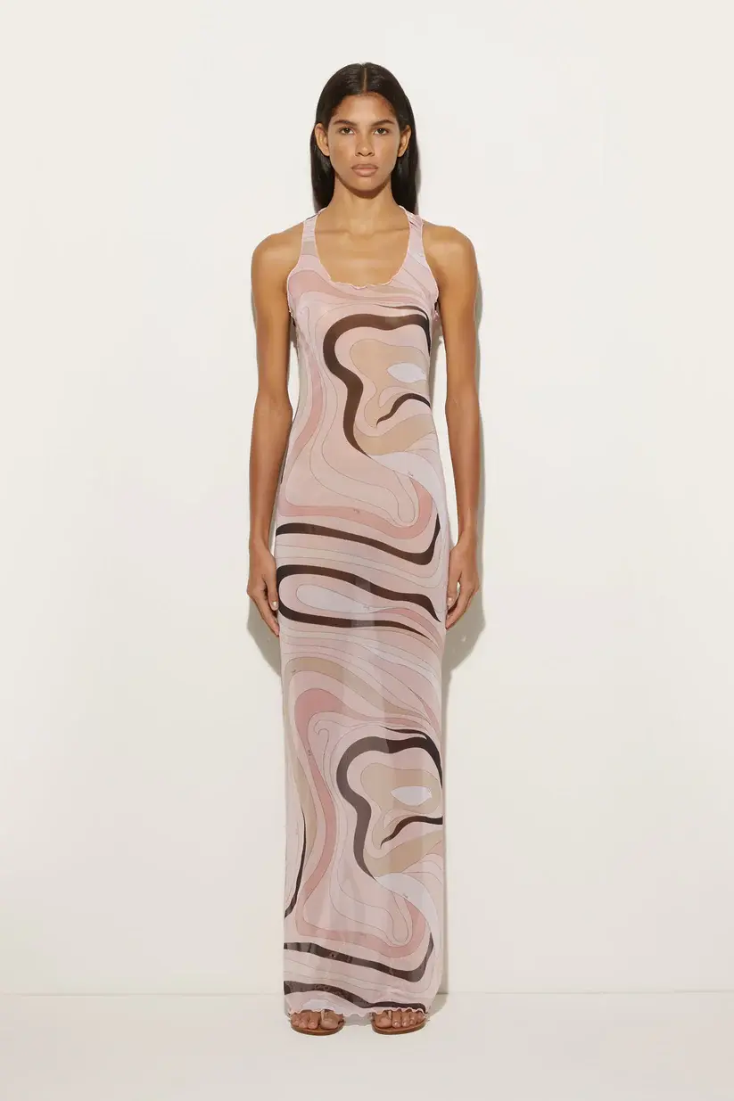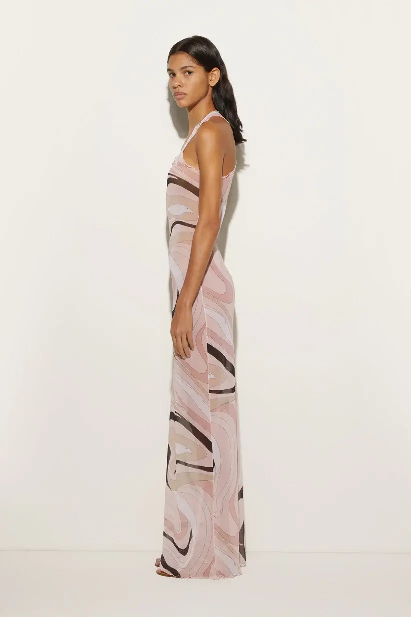 A long dress that blends simplicity and elegance, a sensual contemporary mermaid costume. With its round neckline, straight cut and sleevelessness, this garment fits naturally to the silhouette, enveloping the body like a second skin. Made of a lightweight stretch tulle that combines comfort and style, it is further enhanced by the iconic Marmo print, which adds movement and vibrancy to the design, making this dress ideal for special occasions or elegant evenings.
