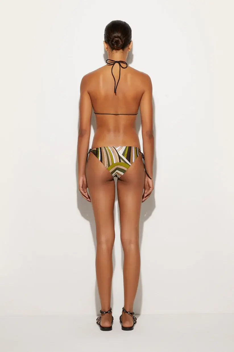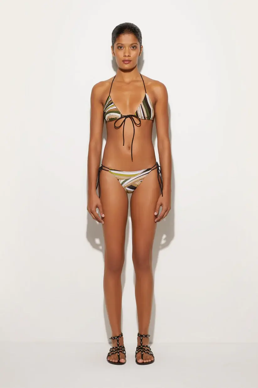 Designed to combine practicality and style, perfect for accompanying you on your relaxing moments in the sun: this adjustable triangle bra, with closures at the neck and in the center, is perfectly suited to any need for comfort and fit. Removable cups allow you to choose the ideal support, making it a versatile garment for any occasion.Made of UV-treated stretch lycra, this bikini not only provides protection under the sun but also features an elegant Iride Baby print in a delicate khaki hue. Ideal for a day at the beach or poolside, it's a piece that combines sophisticated design with smart functionality. Pair it with the matching brief for a flawless look.