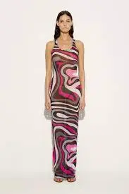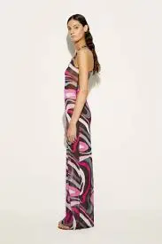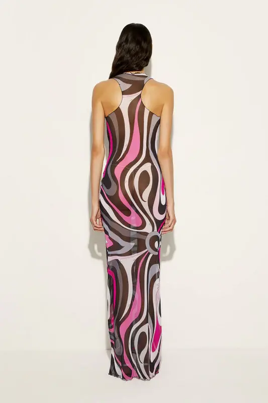 A long dress that blends simplicity and elegance, a sensual contemporary mermaid costume. With its round neckline, straight cut and sleevelessness, this garment fits naturally to the silhouette, enveloping the body like a second skin. Made of a lightweight stretch tulle that combines comfort and style, it is further enhanced by the iconic Marmo print, which adds movement and vibrancy to the design, making this dress ideal for special occasions or elegant evenings.