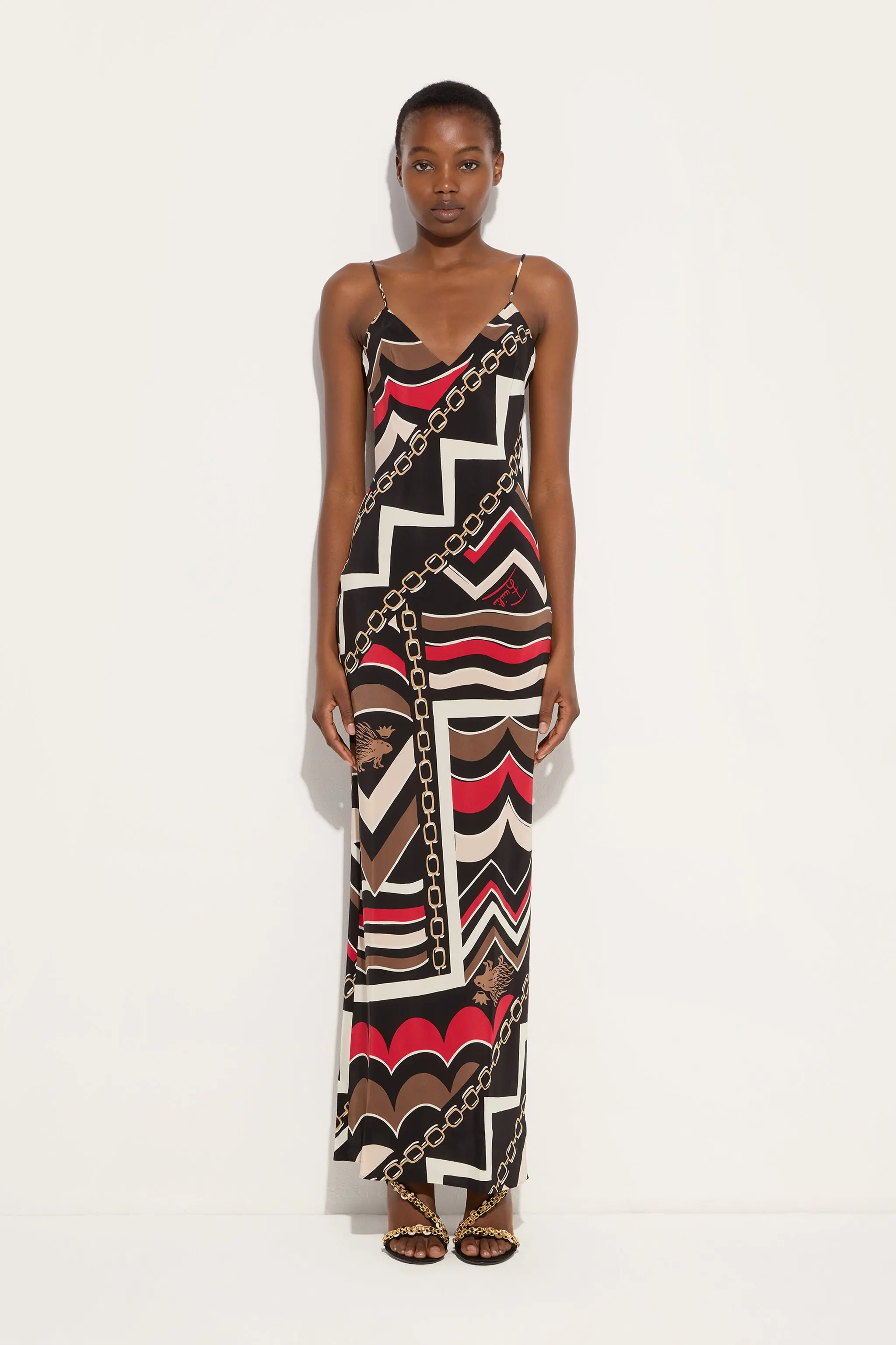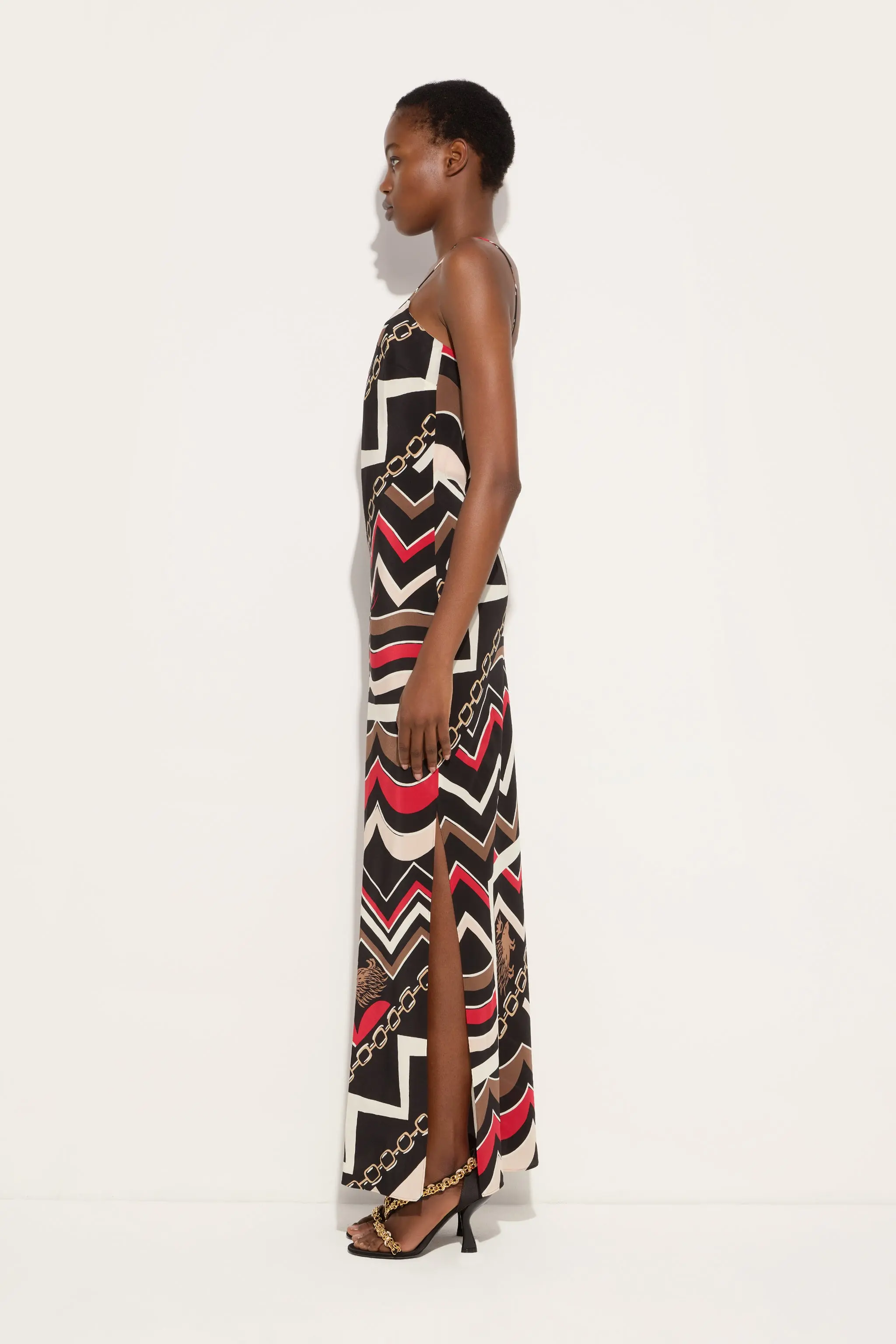 This sleeveless long dress is a perfect balance between elegance and lightness. Featuring a deep V-neckline and thin straps that add a feminine and refined touch, the design is completed by a side slit that enhances the movement of the silhouette.