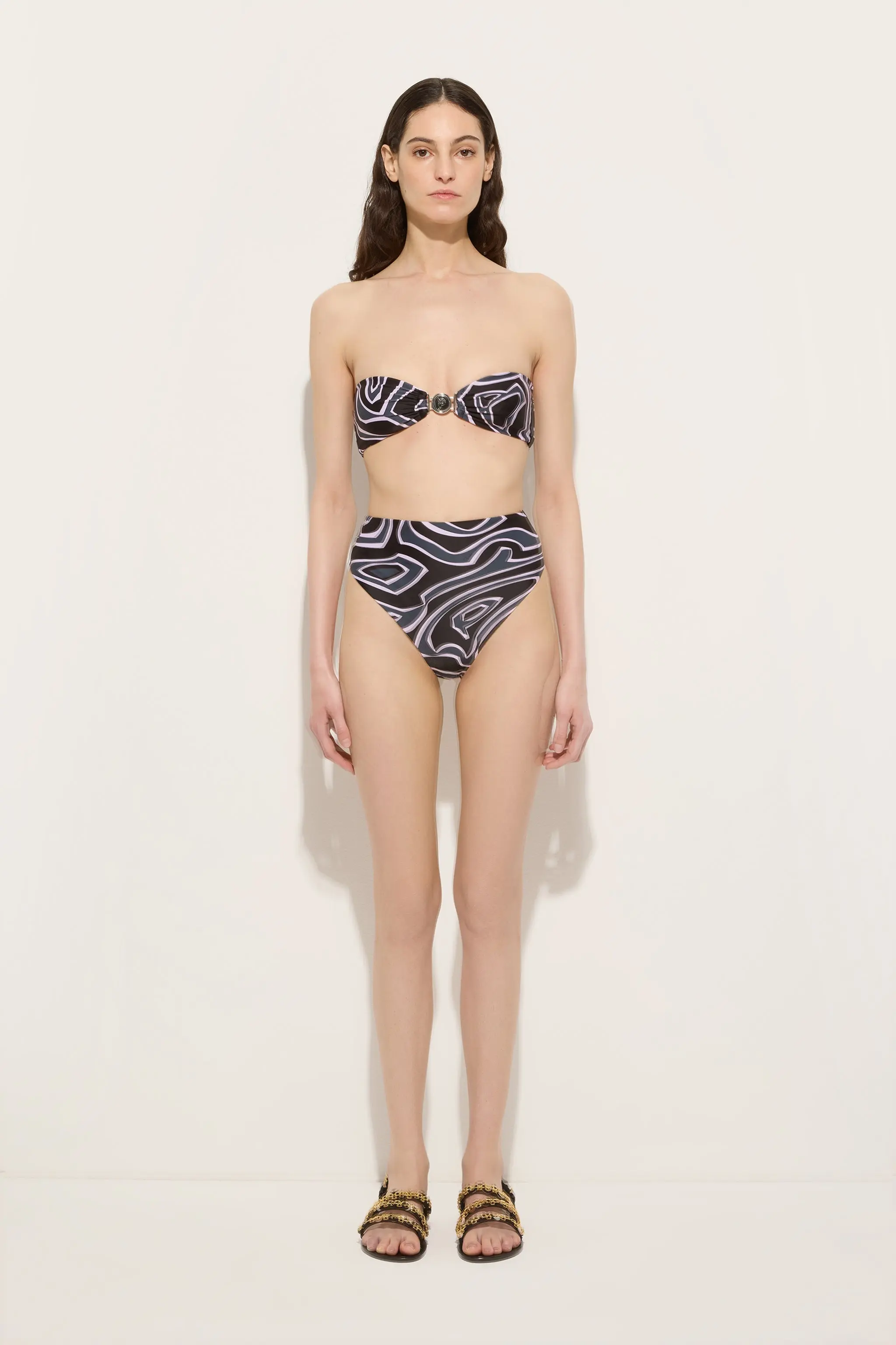 A perfect addition to your beach wardrobe, this strapless bikini top will win you over with its elegant and versatile design. The knotted effect at the center enhances the neckline with a feminine touch, while the stretchy Lycra fabric with UV protection ensures comfort and protection under the sun. The black and pink Labirinto print adds a touch of character, ideal for those who love to stand out at all times. Pair it with the matching high-waisted briefs for a total Pucci look.