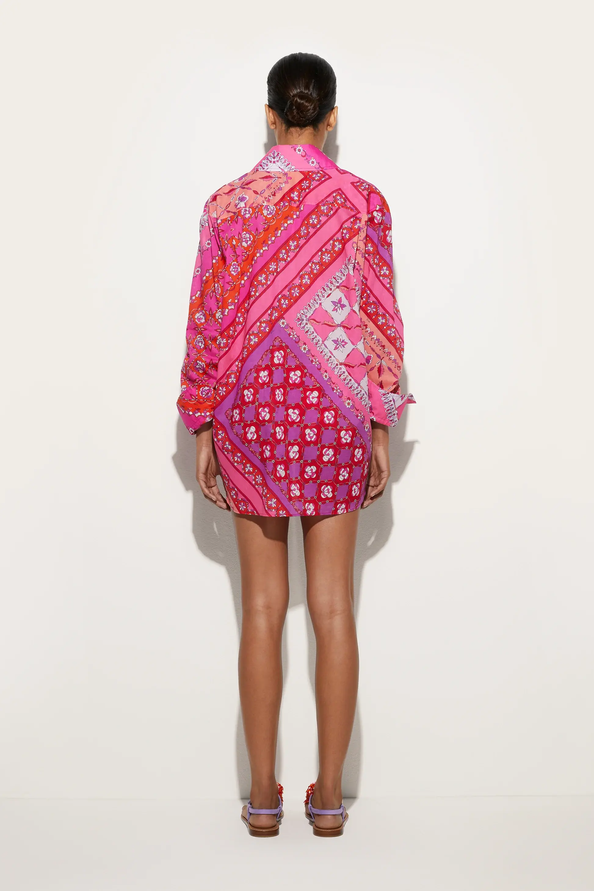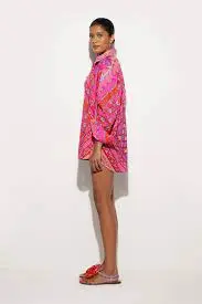 A fresh and sophisticated interpretation of an essential garment. This long-sleeved shirt features a slightly oversized fit that falls naturally, giving a relaxed yet refined allure. The light draped cotton with its soft hand caresses the skin and ensures maximum comfort for any occasion. The classic design, with a collar and button closure, is enhanced by a side pocket, a practical detail that completes the look. The Festa print in shades of coral and fuchsia adds a distinctive touch, turning this shirt into a versatile and timeless garment.