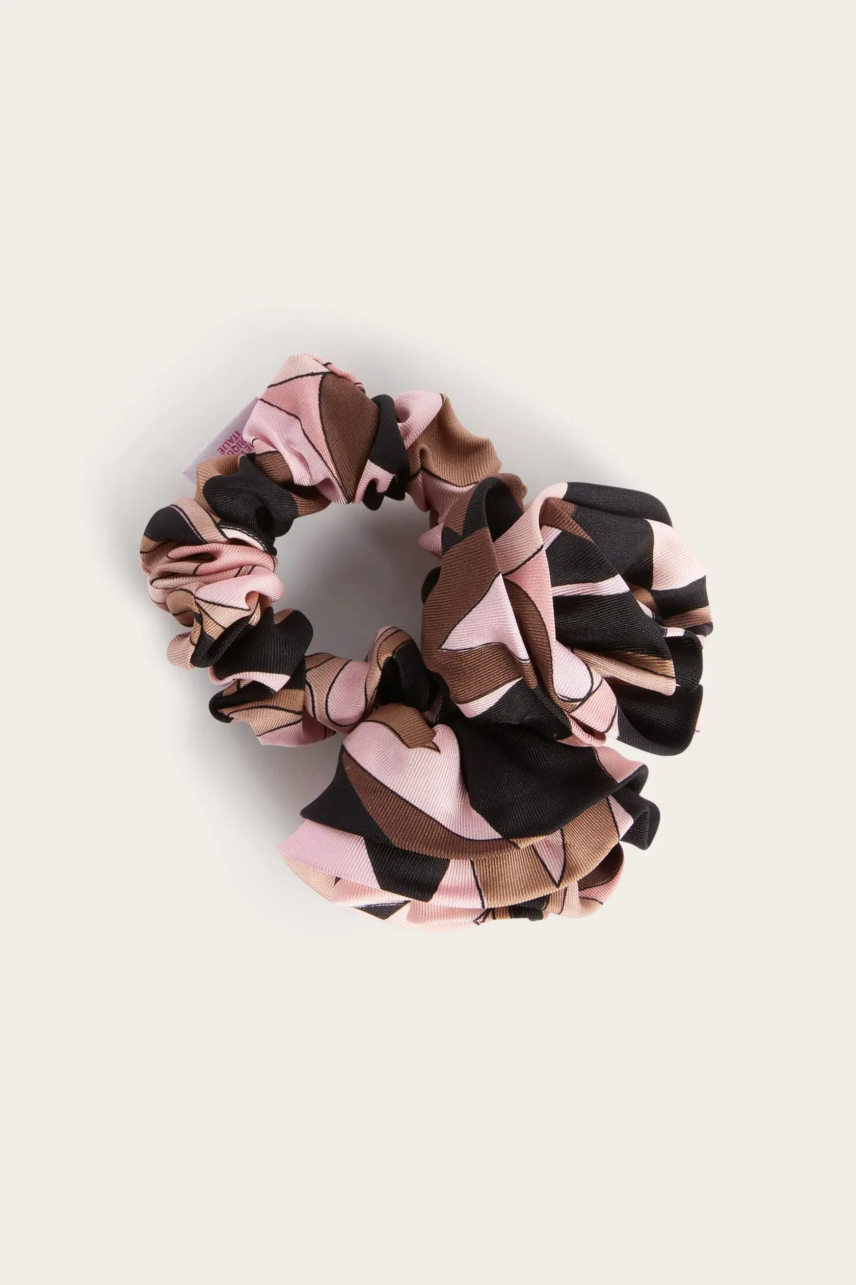 A small accessory that encapsulates the graphic aesthetic of the collection in a delicate gesture. This hair tie is made of pure silk with a Manuba print in nude tones, embellished with a rose-shaped detail that adds a decorative and feminine accent. Soft and lightweight, it is designed to complete your hairstyle with a refined and recognizable touch.