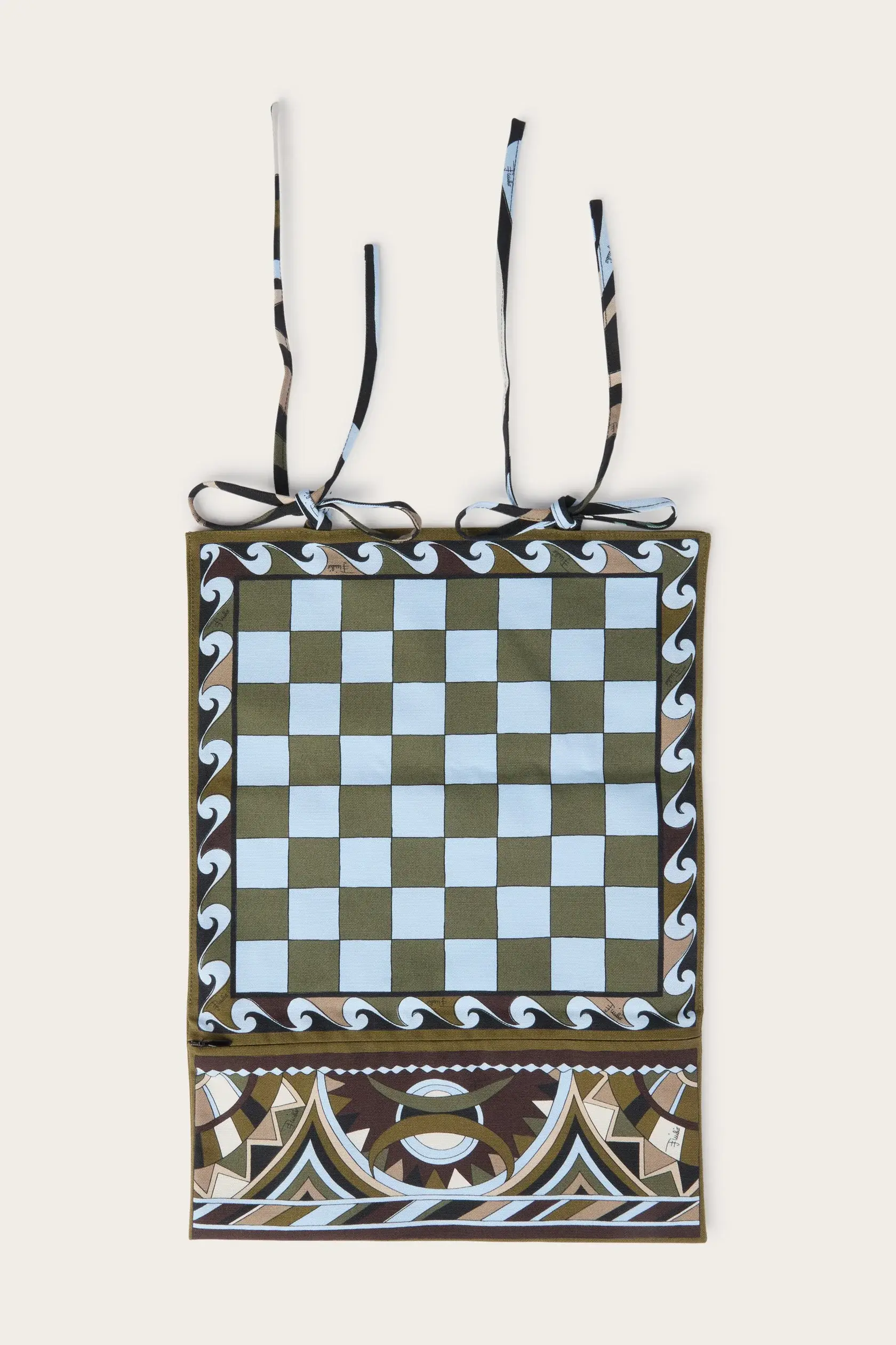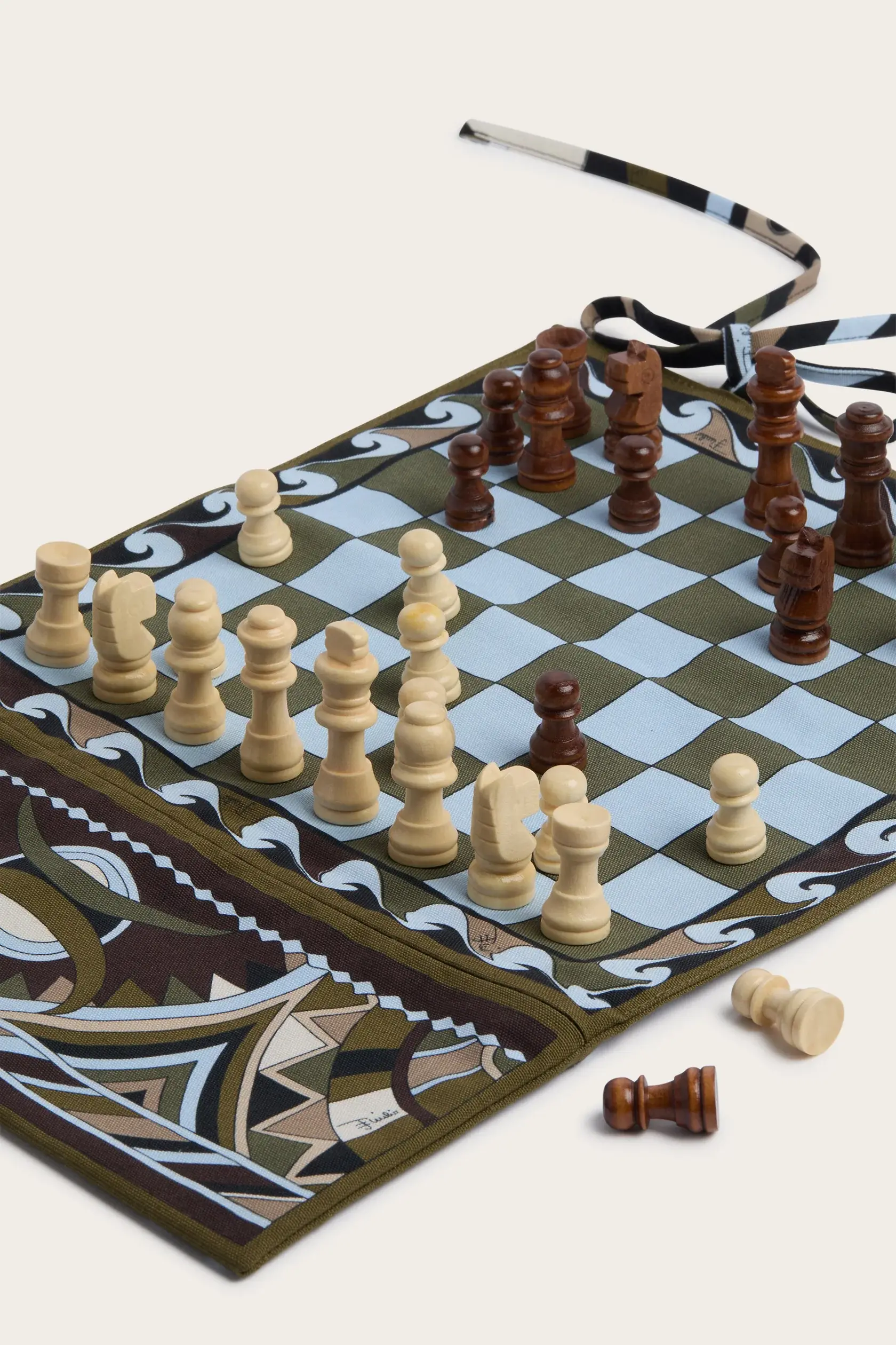 An object that transforms the game into a stylistic exercise. This foldable chess set is made of Vivara printed cotton canvas in shades of khaki and blue, combining functionality and iconic imagery. The compact design opens into a chessboard and features two zippered pockets for the wooden pieces. A balance of craftsmanship, color, and free spirit, designed to be taken anywhere.