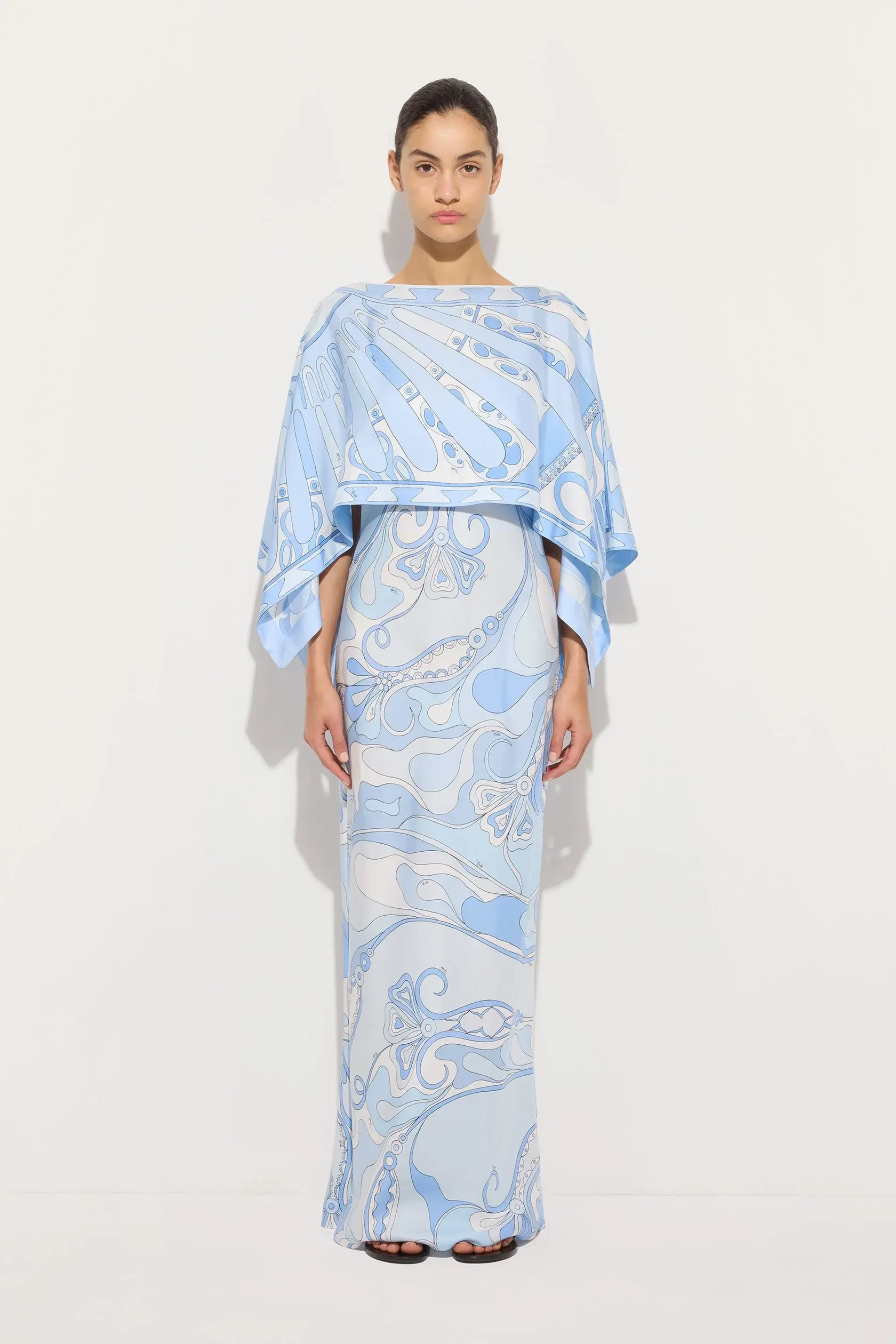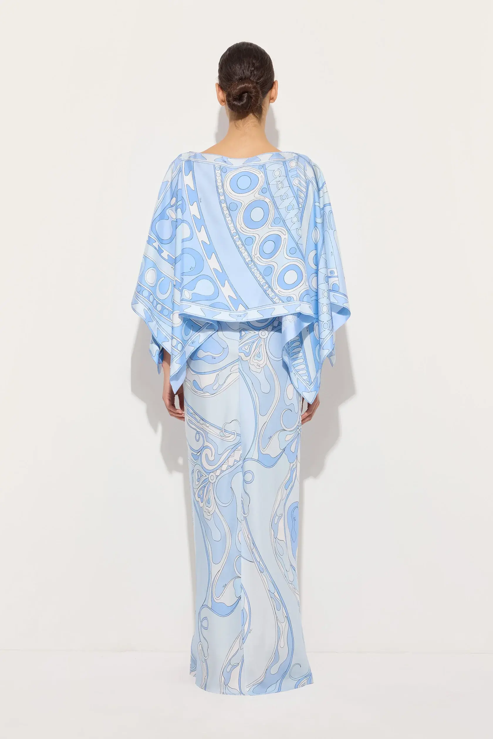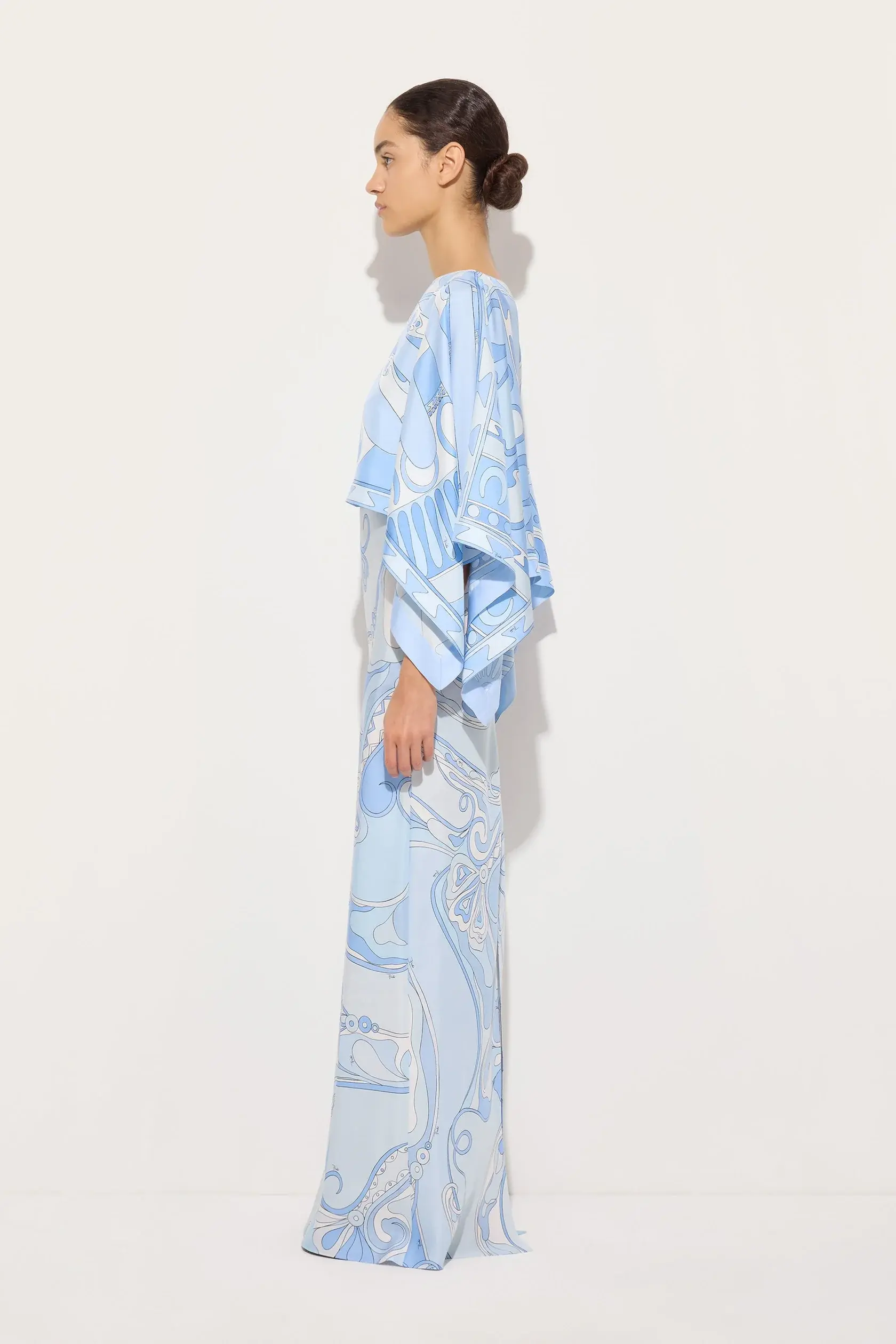A dress with a strong visual impact that plays with volume and movement. Made from silk twill, it features a cape/shawl that delicately envelops the shoulders and flowing, angled sleeves, creating a dynamic and airy silhouette. The Orchidee and Soleil print, in pale blue, run across the garment with a light and refined luminosity, emphasizing the feeling of continuity and lightness.