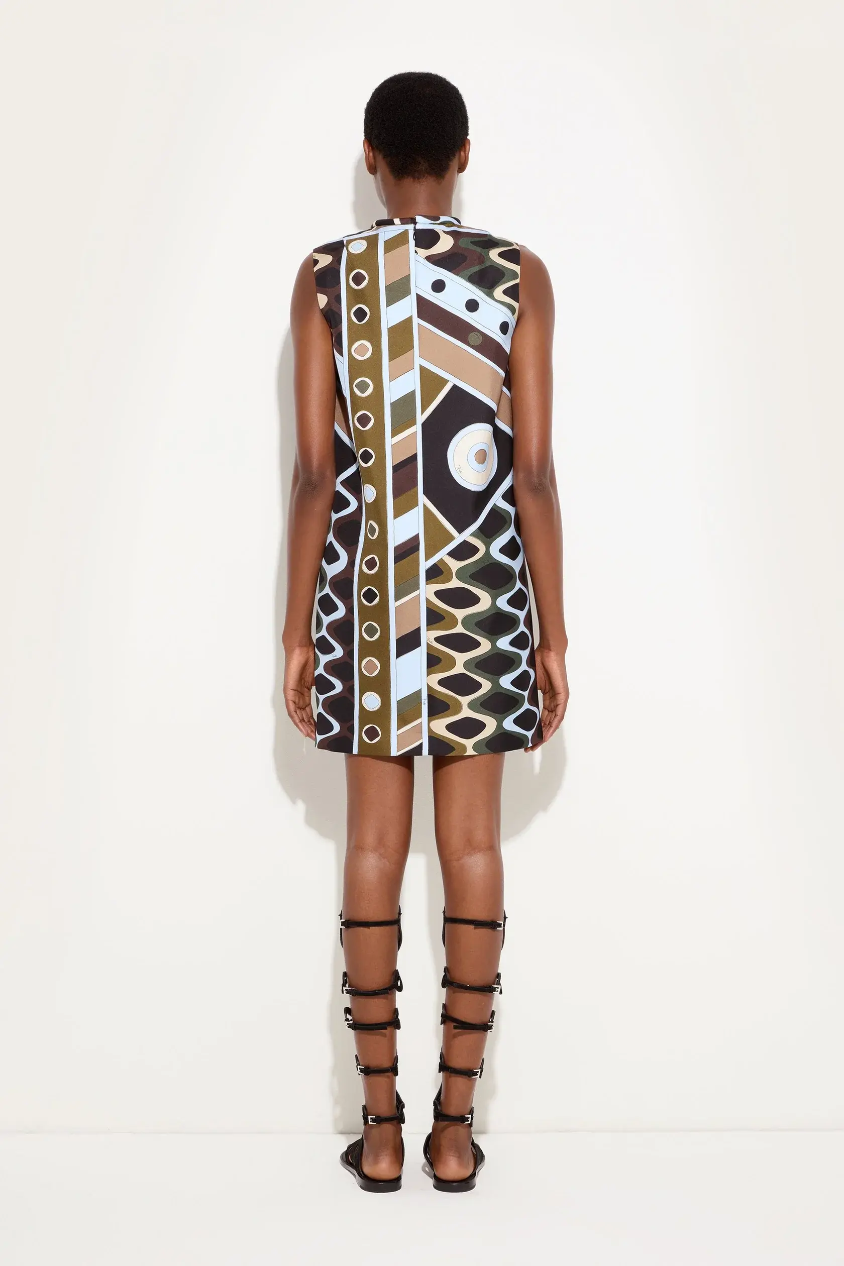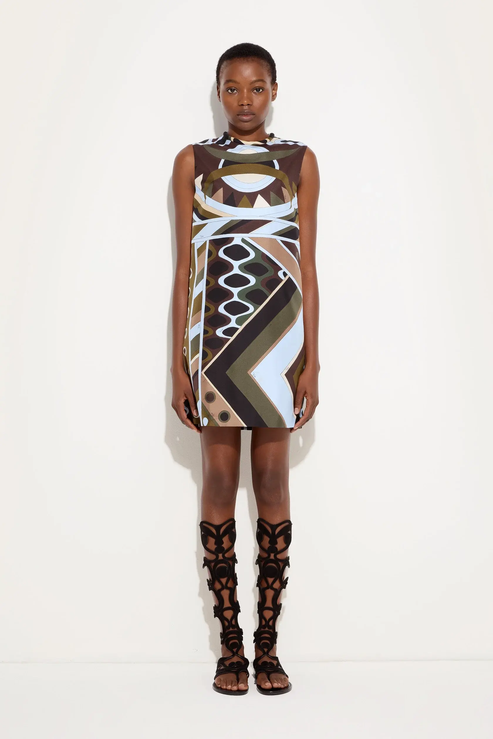 A simple, bright dress that lets the graphic power of the Vivara print shine through. The clean lines of the sleeveless design and round neckline create a balanced silhouette, designed to enhance the body's natural movement. The silk twill provides structure and fluidity, while the khaki and blue print enlivens the surface with a vibrant, contemporary rhythm. A refined garment where color and material take center stage.