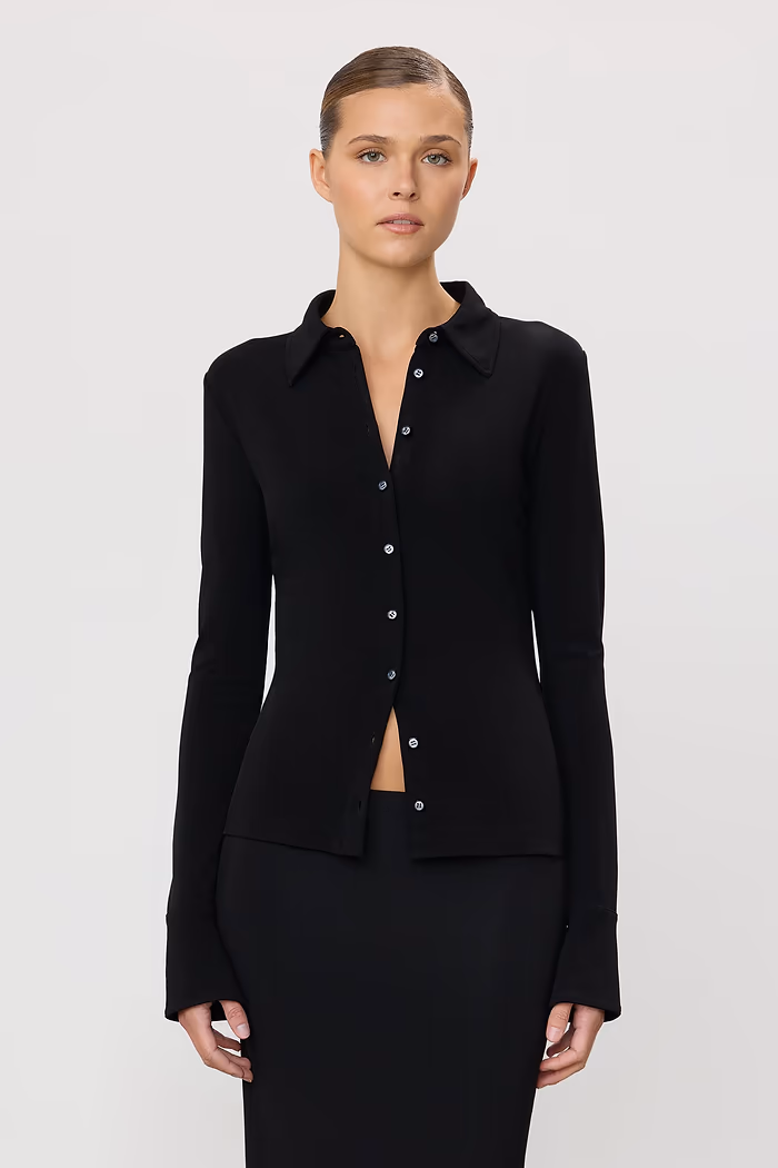 ÉTERNE's Charlie Top is crafted from our matte stretch jersey, offering a slim fit, classic button-down silhouette and flared cuffs—a versatile essential for day to night.