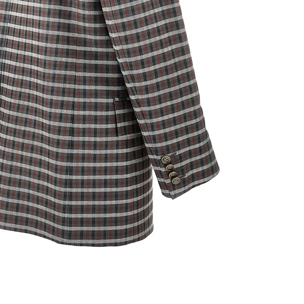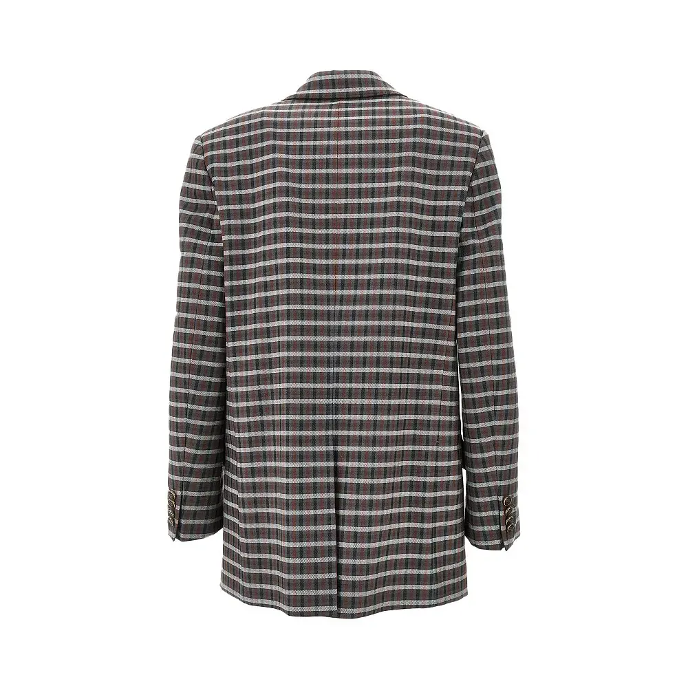 Tailored jacket made from stretch wool-blend twill with check motif, featuring oversized fit with padded shoulders. Double-breasted closure with antique gold finished metal Pegaso buttons, side welt pockets with flap, trimmed chest pocket, buttoned cuffs and rear middle split. Lined.
