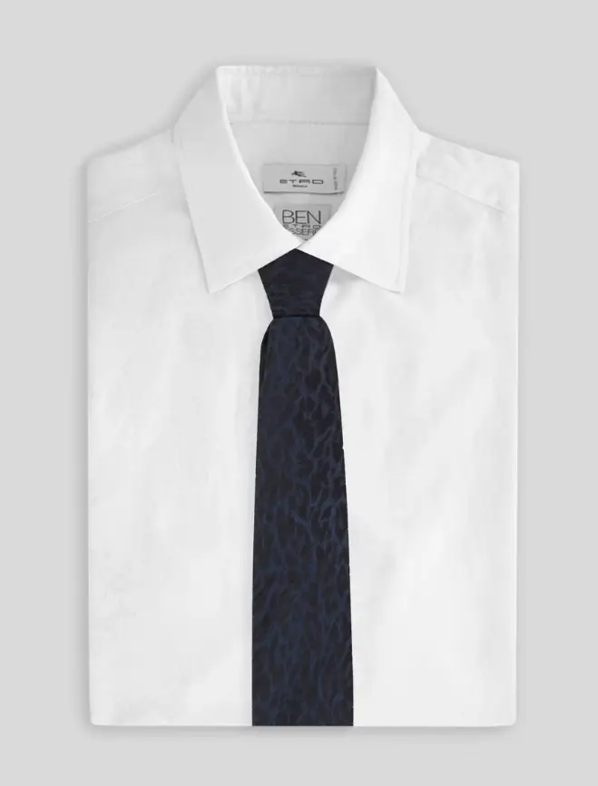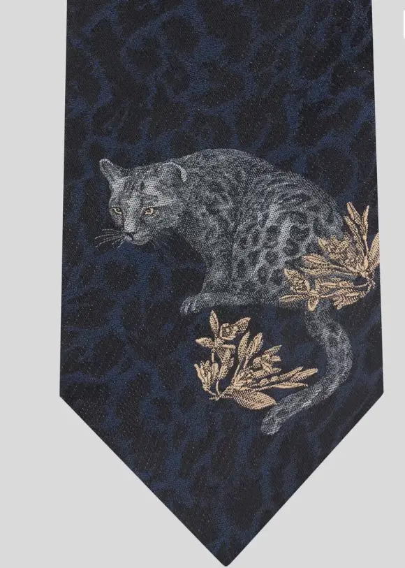 Pure silk tie with jacquard detailing. This accessory stands out for its neutral-coloured leopard and two floral-inspired elements superimposed over an all-over animal motif. The contrasting label with Pegaso symbol and ETRO logo completes the design. • Blade width: 3.1 inches (8 cm) • Made in Italy