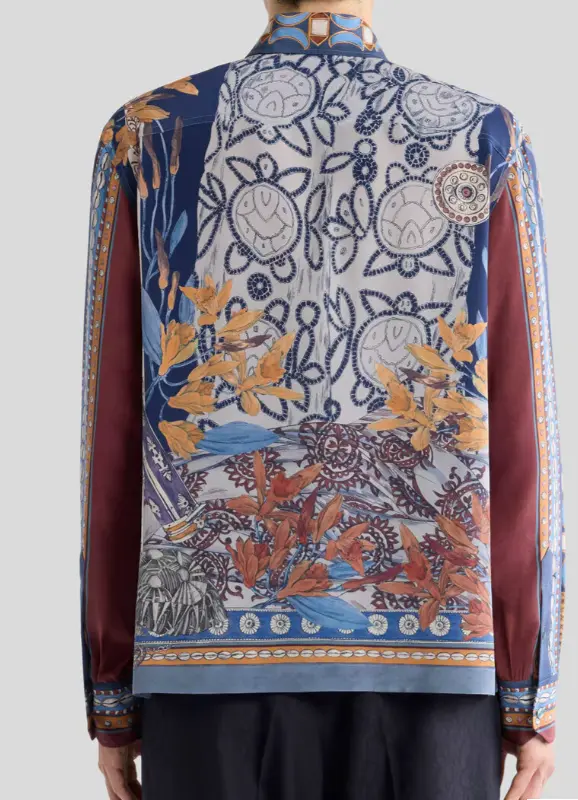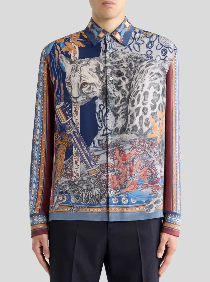 Relaxed-fit long-sleeved shirt in pure silk fabric. This piece stands out for its placed print depicting a neutral-coloured leopard alongside multicoloured floral and abstract elements. Completing the garment is a geometric motif featuring small shells along the sleeves and hem.