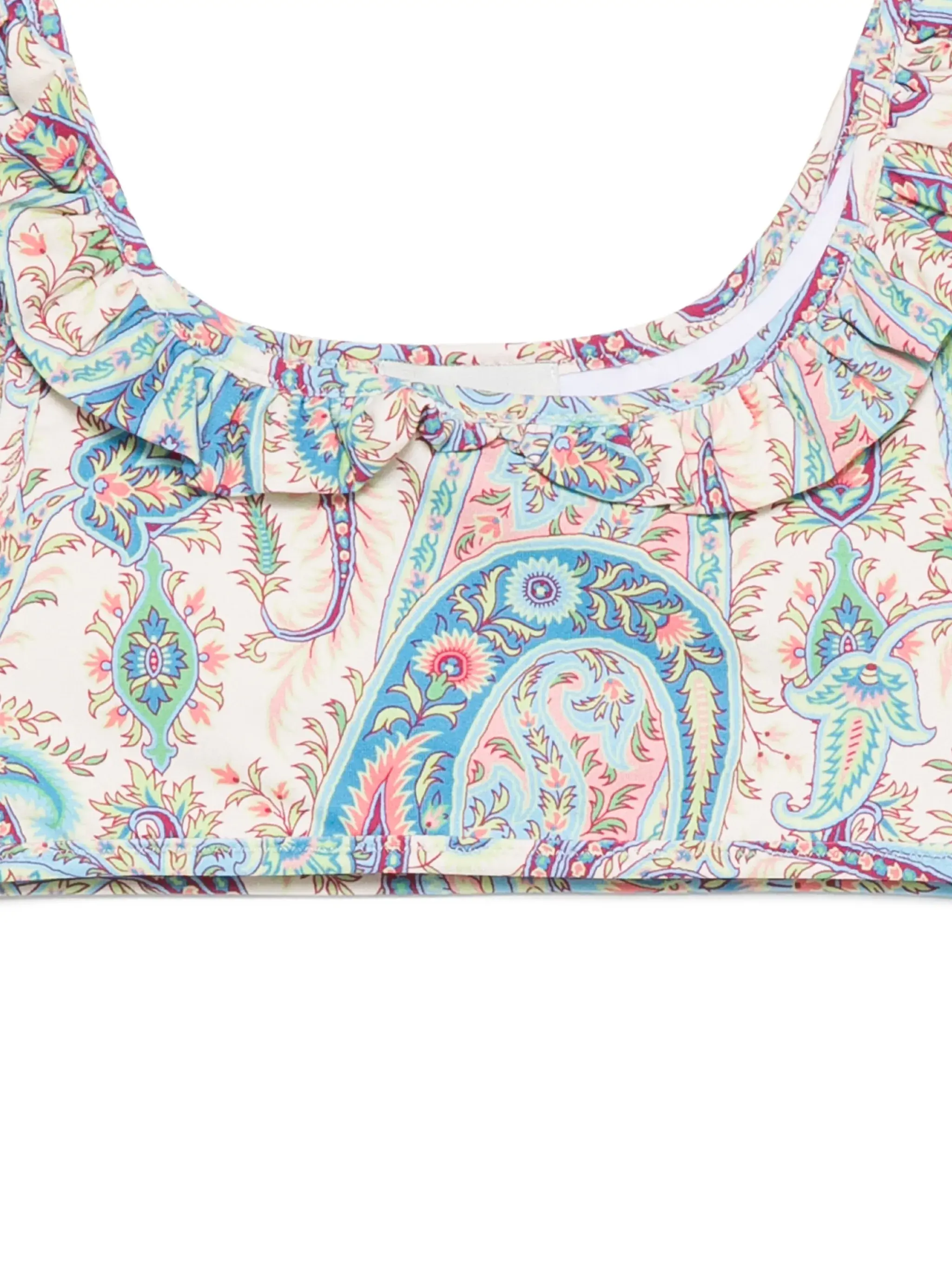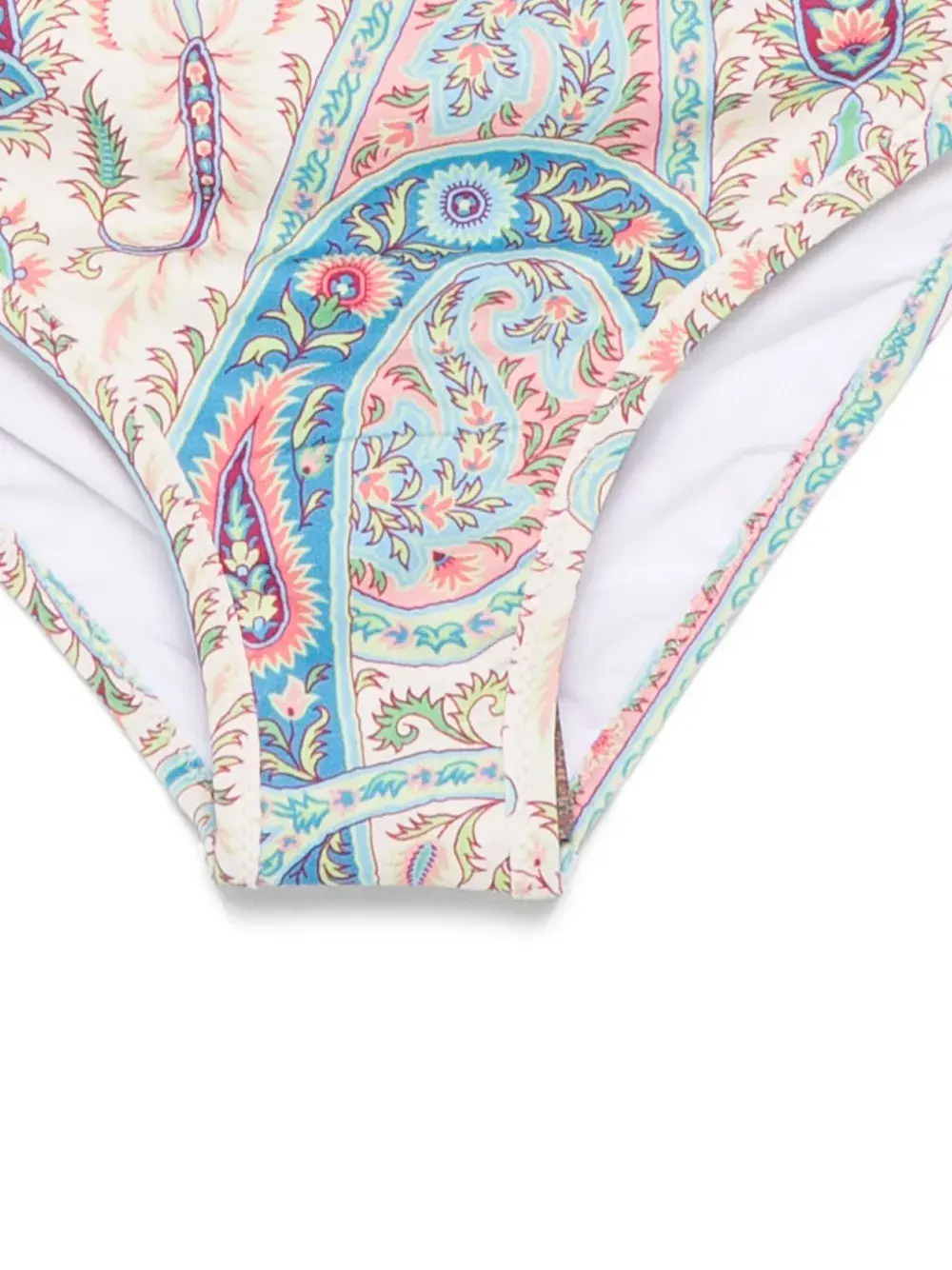 Highlights off white paisley print ruffled trim Be mindful to try on swimwear over your own garments.