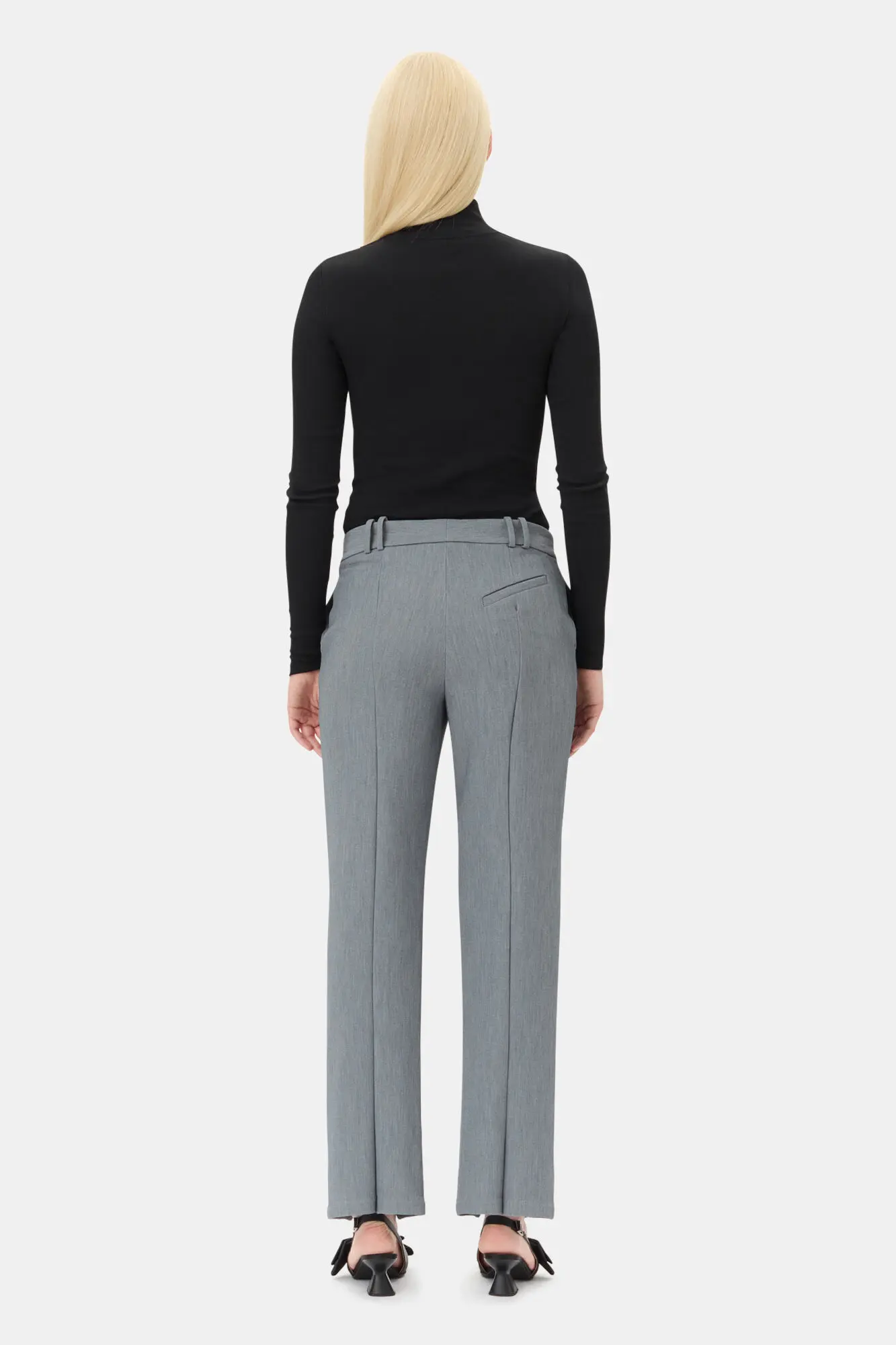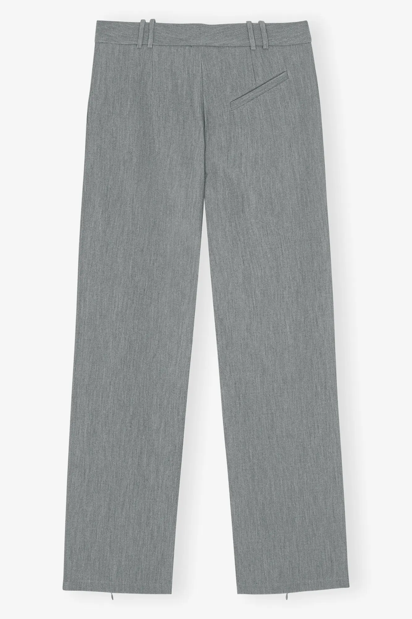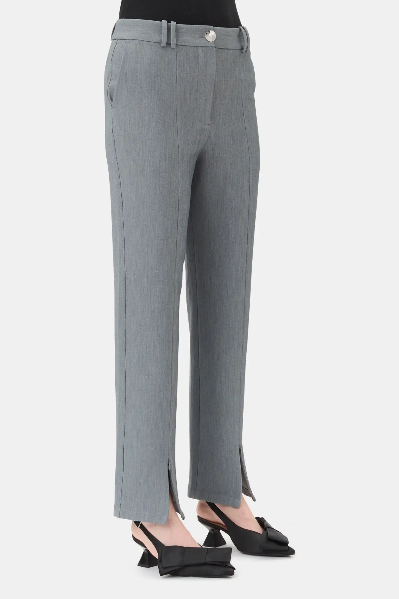 These Grey Suiting Trousers feature a mid-rise waist with a zip and button closure, belt loops, and side pockets. The trousers have front slits with a discreet zipper and a pocket at the back.